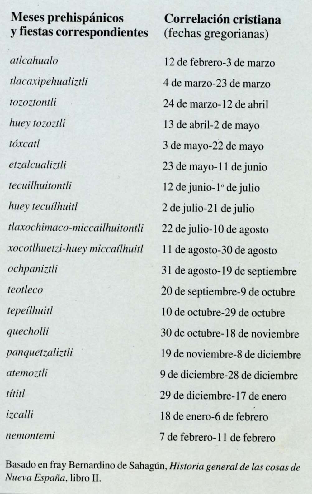 Fray Bernardino de Sahagún establece en el Libro ii de su Historia General “Que trata del Calendario, Fiestas y Ceremonias…”, que el primer mes del año era Atlcahualo.9 El año iniciaba según este cronista, el Día de la Candelaria, o sea el 2 de febrero, lo que equivale a la fecha del 12 de febrero después de la Reforma Gregoriana de 1582.