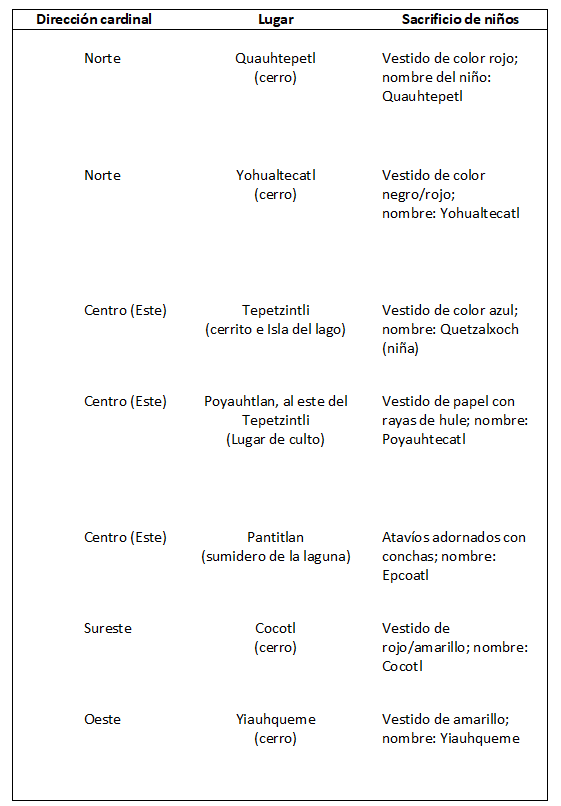 Los lugares donde mataban los niños son los siguientes: el primero se llama Quauhtépetl: es una sierra eminente que está cerca de Tlatelolco. A los niños, o niñas que allí mataban poníanlos el nombre del mismo monte, que es Quauhtépetl; a los que allí mataban componíanlos con los papeles teñidos de color encarnado.