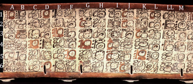 La columna i (véase Tabla 1) representa la última hilera de la composición en la cual se evidencia la Fórmula Dedicatoria conformada, aparentemente, por cinco cartuchos jeroglíficos dispuestos secuencialmente de manera vertical, lo que rompe con la distribución cuatripartita del resto de columnas.