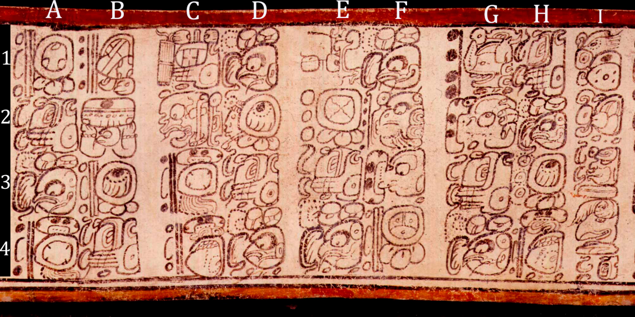 A continuación realizaré el proceso de transliteración, transcripción y traducción únicamente de la columna i del vaso K955, dado que muestra la información más relevante para la temática abordada en el presente trabajo.13 Cabe señalar que en las dos primeras fases del análisis, todos los signos cuya lectura se esté proponiendo de manera tentativa aparecerán acompañados de un signo de interrogación; asimismo, los caracteres que se encuentren entre corchetes señalan una reconstrucción.14