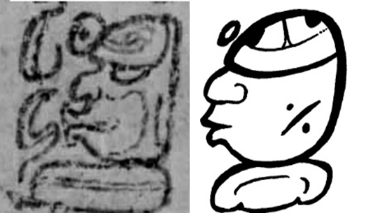 En el caso del vaso K955 y teniendo en cuenta que, según la traducción propuesta, el líquido contenido podría tener características ígneas (ya que aparece el sustantivo “fuego” en su versión logográfica K’AK’), es muy probable que se estuviese haciendo referencia, a través del uso de un recurso literario, al pulque o chih, bebida alcohólica (a la que la deidad estaba unida) obtenida a través de la fermentación del aguamiel adquirido del maguey (Agave salmiana).16 Con base en lo anterior, el recurso que se está empleando es la metáfora (Lacadena, 2009: 39) ya que en ningún momento se está refiriendo al chih en sí, sino que es a través de la alegoría “fuego [de] Ahkan” como podemos intuir el verdadero significado del pasaje. El apelativo se compone de una cabeza con un signo de oscuridad, ak’bal en la parte superior, así como el característico elemento en forma de globo ocular fuera del cráneo; la presencia de la sílaba -na en la parte inferior (véase Figura 5) refuerza la interpretación al funcionar como complemento fonético del nombre, algo característico en las referencias a la entidad que se encuentran en otras cerámicas clásicas, tal y como observó Grube (2004: 60) anteriormente.