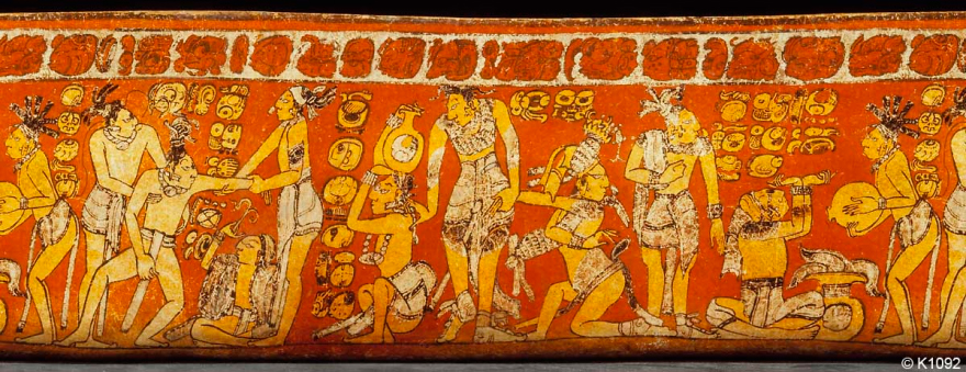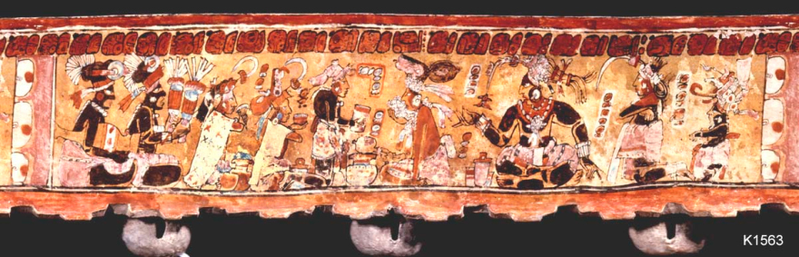 La sucesión dinástica se iniciaría en la fecha 12 chuwen 19 k’anjalaw, misma que se dispone como fecha inicial en otros tres vasos de la colección (K1005, K2094 y K5863), la presencia de ésta data del formato de Rueda Calendárica8 y no de Cuenta Larga9 (que aparece únicamente en el vaso K6751) es lo que ha dado lugar a controversia a la hora de fechar los eventos registrados o al considerarlos históricos o mitológicos.10 Jeroglíficamente, se pueden reconocer cinco nombres de ajawo’ob acompañados del glifo emblema dinástico: el conocido como Sostenedor del cielo (cartucho jeroglífico [c. j.] B2), Ch’am Taj K’inich (c. j. C1), Chan Chak Chapat (c. j. E1), Yax Jol (c. j. F3), y Yax Jatz’ Jol (c. j. G2); de todos éstos sólo el segundo portará el importante título de poder kajlo’mte’.11