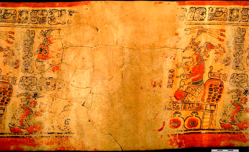 En el centro de la composición, uno de los personajes tiene uno de sus pies más levantado que el otro y la rodilla semiflexionada, lo que simboliza el acto de bailar (García Barrios y Valencia, 2007: 29), además se identifica a dos personas asociadas a grandes vasijas con el signo chi[h], donde destaca el objeto de la derecha, ya que de él emergen lo que parece representar pencas de maguey; asimismo, encima de la figura puede leerse el compuesto AJ-chi-hi?, aj chih, “persona del pulque”, destaca la presencia del signo AJ- que funciona como afijo agentivo (Jackson y Stuart, 2001: 222), que refuerza la interpretación ‘persona’ (Martin, 2012: 4). La escena se completa con uno de los personajes en claro estado de embriaguez, ayudado por dos compañeros para mantener la compostura. De esta manera, se puede discernir que mientras había personas encargadas de producir atole, otras se dedicaban a la obtención del pulque; ahora bien, debido a las limitadas referencias clásicas que conocemos hasta la fecha sobre la bebida fermentada y al proceso de elaboración, podríamos pensar que su producción estaba restringida. Sin embargo, considerando lo que Diego de Landa registra en su obra: