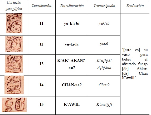 Con base en lo presentado hasta el momento, los cartuchos I4-I5, que podrían corresponder a la parte final del posible nombre del dueño, se componen de tres signos diferenciados; el primero responde a una variante en forma zoomorfa del logograma CHAN acompañado de una tentativa sílaba -na que complementaría al signo principal en el que parece reconocerse una testa aviar con una posible marca de espejo en la parte superior. Cierra toda la secuencia narrativa el cartucho I5 en el que se representa en su forma logográfica completa el nombre de K’awiil, que se asocia a una de las deidades principales del panteón maya.