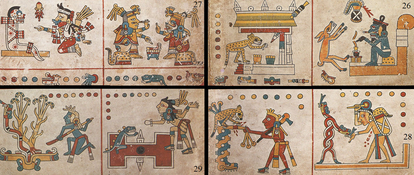 A principio del siglo xx, tuvieron un nuevo auge las especulaciones astronómicas inauguradas por el padre Fábrega. Eduard Seler, el estudioso alemán célebre mundialmente por sus profundos estudios sobre las antigüedades mexicanas, propuso en el volumen 35 de la prestigiosa revista Zeitschrift für Ethnologie (1903) una teoría interesante.24 Según él, los antiguos nahuas ajustaban su año en razón de 10 días cada 42 años. Seler llegó a esta conclusión por medio del estudio detenido del Códice Fejérváry-Mayer, en particular de la sección inferior de las láminas 26-29 (véase Imagen 3) que, en su opinión, presentaban un periodo de 59 días. Estos 59 días multiplicados por 260 daban por resultado un ciclo mayor de 15 340 días y éste correspondería a 42 años solares, más un periodo de 10 días.25 Estos últimos 10 días, añadidos al final de un periodo de 42 años, representaban para Seler el ajuste a manera de “bisiesto” que realizaban los antiguos mexicanos: