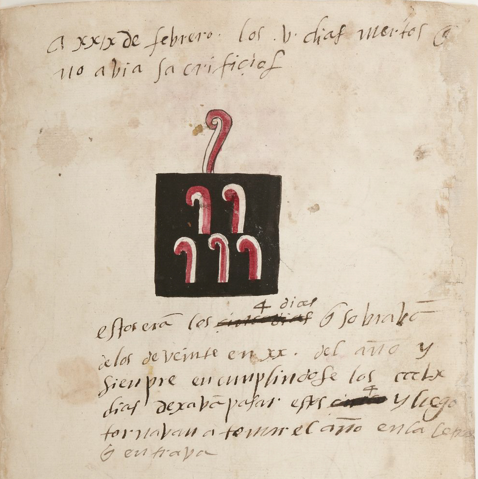 A xxix de febrero. los. v. días m[u]erto q[ue] no [h]abía sacrificios // Estos eran los cinco días 4 días q[ue] sobraba[n] de los de veinte en xx. del año y sienpre en cumpli[é]ndose los ccclx días dexaba[n] pasar estos cinco 4 y luego tornaban a formar el año en la letra q[ue] entrava. (Quiñones, 1995: 17)