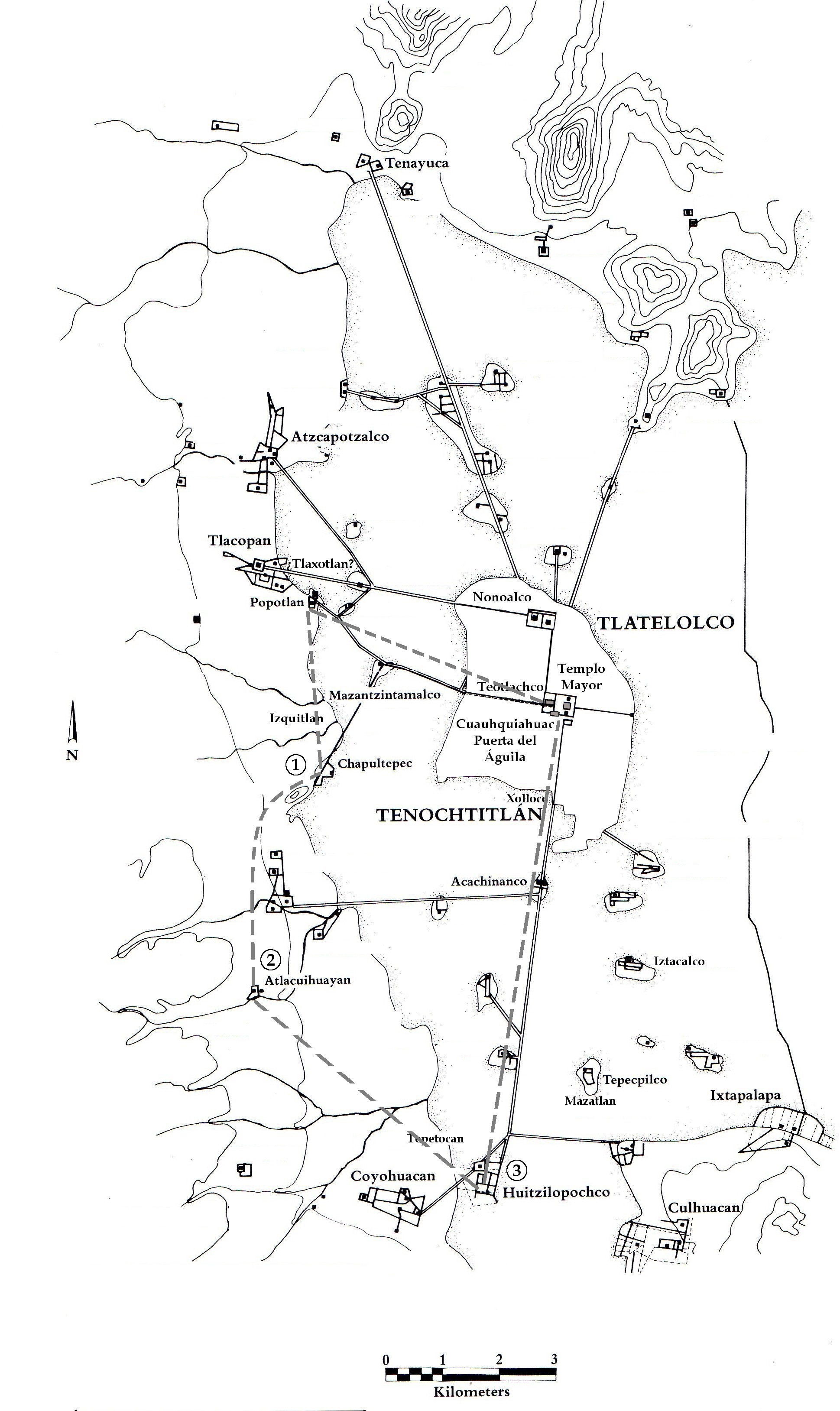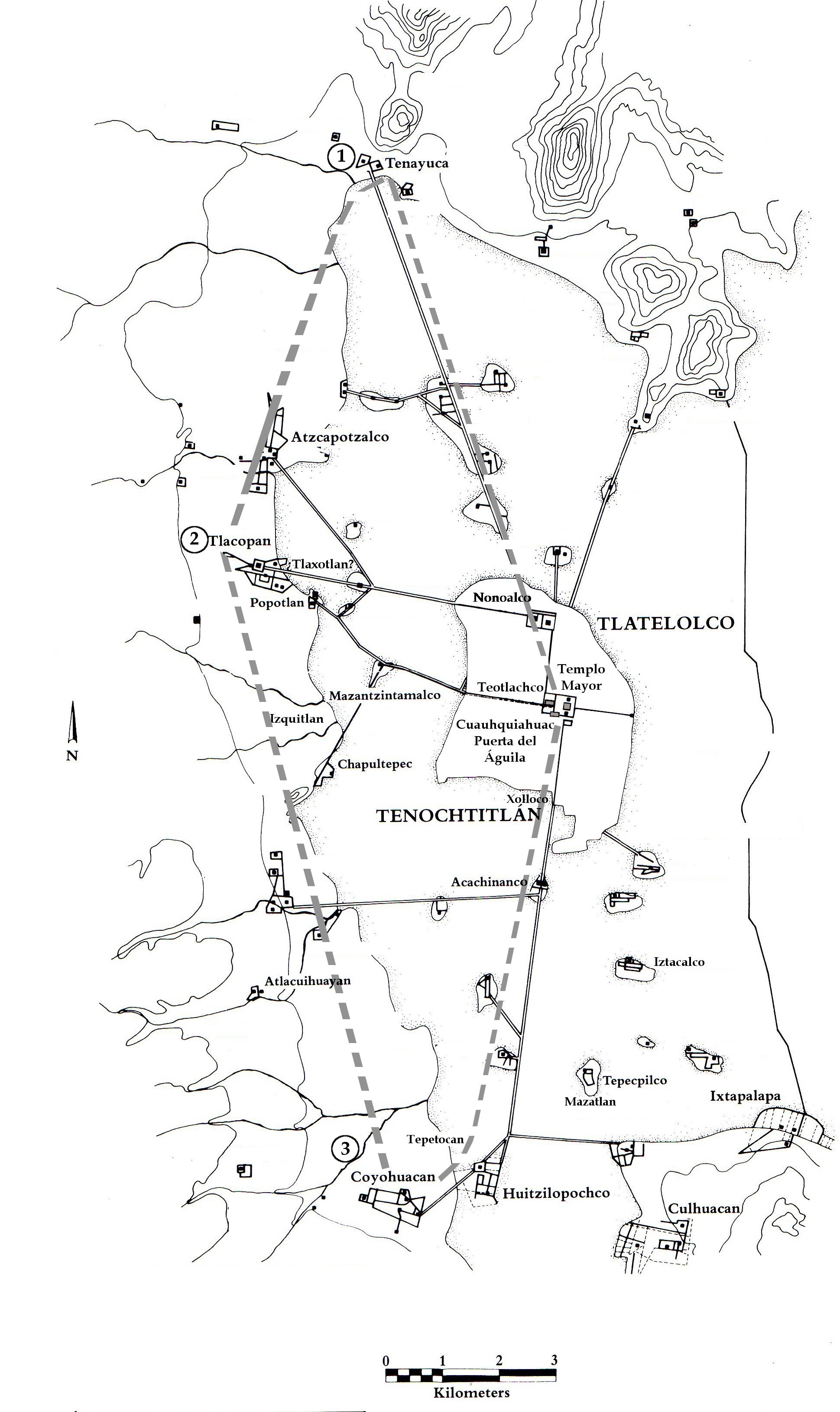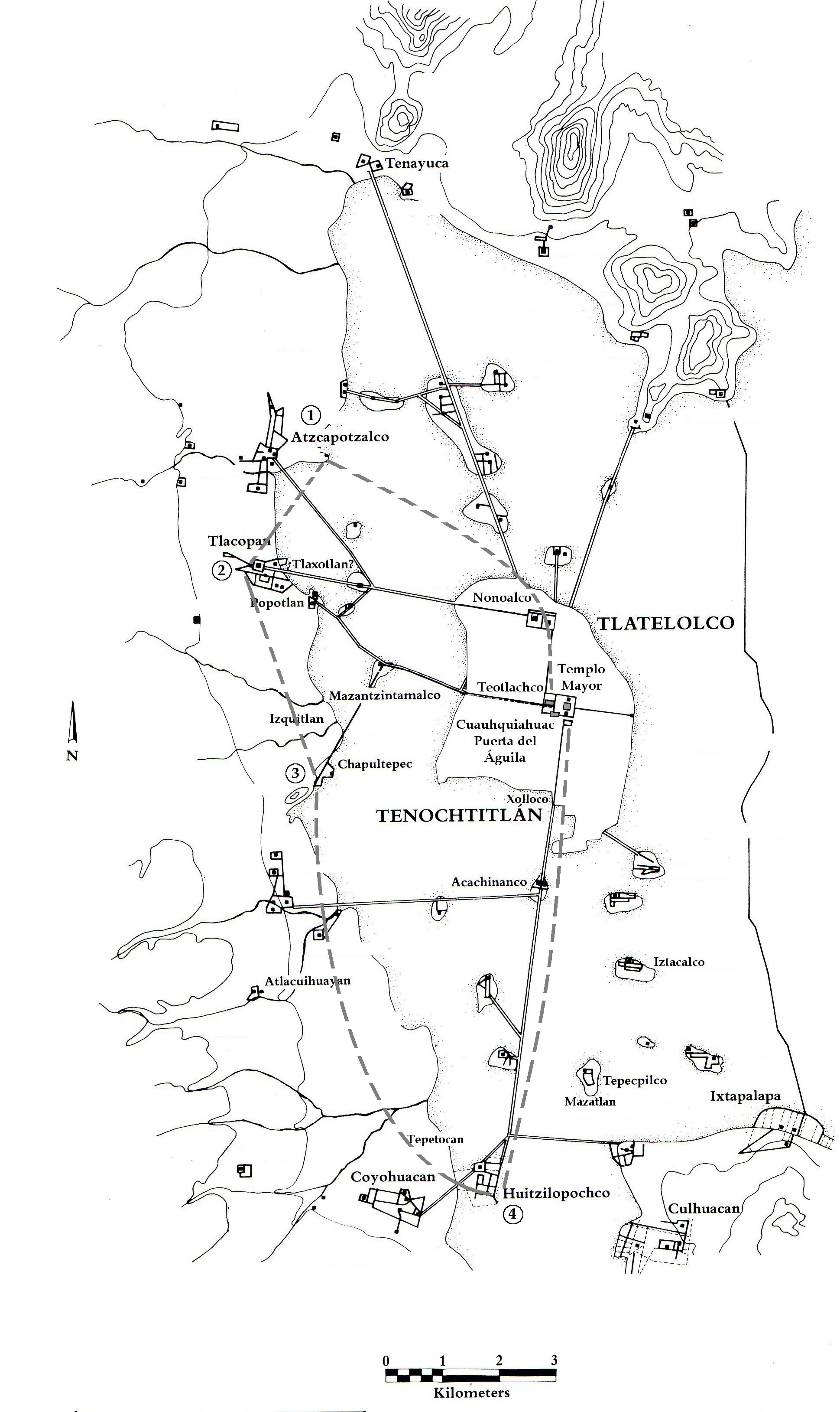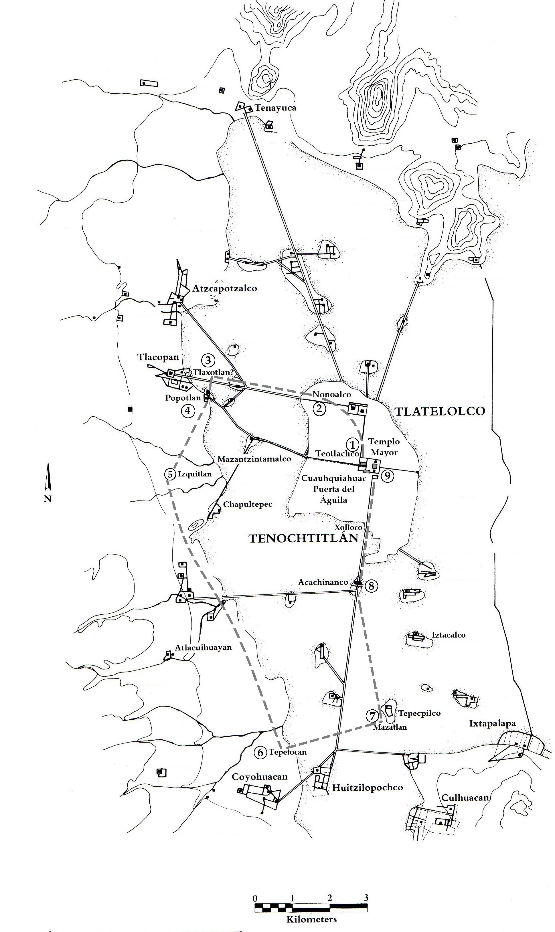 Después de la derrota de Azcapotzalco en 1421, Nonoalco se había vuelto parte del territorio de la ciudad gemela de Tenochtitlan. La relación entre el linaje tlatelolca y el tepaneca no nos debe sorprender, ya que queda plasmada en la historia misma de Tlatelolco, misma que buscó alianzas en la familia real tepaneca de Tezozomoc y logró obtener como soberano a Cuacuauhpitzahuac, uno de sus hijos (Garduño, 1997: 59; Castañeda de la Paz, 2013: 234). La hegemonía tlatelolca duró hasta 1473, año de la conquista de la ciudad por parte de las tropas de Axayácatl. La hipótesis que presento permitiría identificar a los dos protagonistas divinos de la Ipaina Huitzilopochtli como los dos aliados principales de Huitzilopochtli, uno siendo el representante de México-Tenochtitlan, y el otro, quizá, de México-Tlatelolco. A este respecto, también hay que señalar que el camino elegido por el cortejo descrito en el texto sahaguntino pasaba precisamente por la calzada que conectaba Tlatelolco a Tlacopan, a través de la pequeña isla de Nonoalco (Caso, 1956: 41). Ahora bien, dos caminos permitían alcanzar la ribera oeste del Valle: el de Nonoalco y la calzada utilizada por los habitantes de México-Tenochtitlan, que desembocaba en Popotlan, conocida como la Calzada de Tlacopan. Como ha sido subrayado por Francisco González Rul (2007: 197), la presencia de esta doble ruta de comunicación databa de la época en la que Tlatelolco representaba todavía un altepetl independiente. Por esta razón, exactamente como Tenochtitlan, Tlatelolco necesitaba de un camino que la unía a Tlacopan y de paso a Azcapotzalco por razones comerciales.