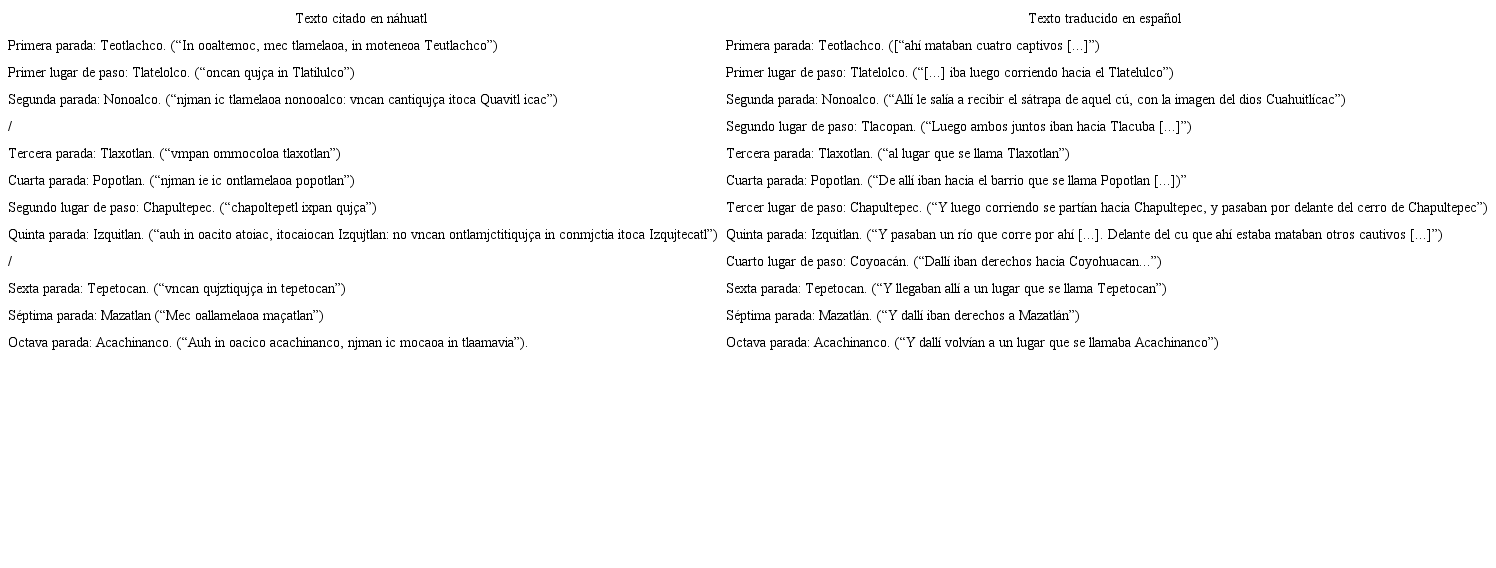 A manera de conclusión, me parece significativo subrayar cómo en el Libro 2 de la Historia General se mencionan catorce espacios, sin embargo, los lugares donde se llevaban a cabo sacrificios, ceremonias o simplemente paradas, sólo eran ocho: Teotlachco, Nonoalco, Tlaxotlan, Popotlan, Izquitlán, Tepetocan, Mazatlán y Acachinanco.23 Ahora bien, sólo tres de éstos están relacionados de forma evidente con la memoria mexica de la época de las peregrinaciones: Popotlan, Tepetocan y Mazatlán.24 Teotlachco, Nonoalco, Tlaxotlan, Izquitlán y Acachinanco no aparecen mencionados.25 En cambio, Tlatelolco, Tlacopan, Chapultepec, Coyohuacan y Cuauhquiahuac, parecen más bien “lugares de paso” durante el recorrido ritual, aunque Chapultepec sea un lugar muy significativo de la etapa migratoria mexica. Igualmente, la lista de lugares del Libro ix del Códice Florentino está conformada por siete lugares, de los que probablemente sólo cuatro eran paradas: Nonoalco, Popotlan, Chapultepec (esto es, Izquitlán) y Mazatlán (véase Tabla 1).26