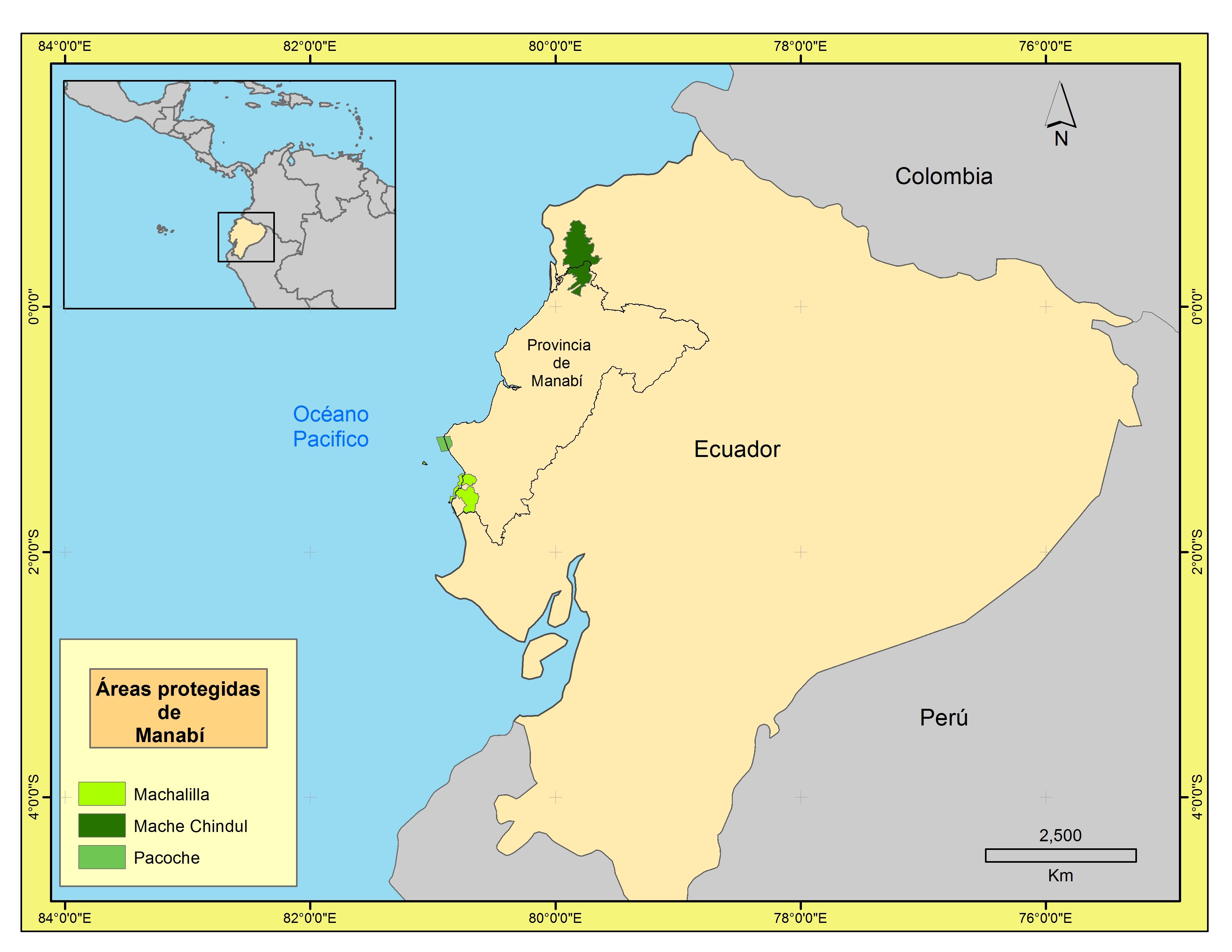 Refugio de Vida Silvestre Marino-Costero Pacoche (2008): se ubica en los cantones Manta y Montecristi de la provincia de Manabí. Abarca 5 045ha de bosque húmedo tropical y bosque seco tropical, y 8 500ha del área marino costera. La franja litoral tiene un clima tropical megatérmico árido a semiárido con temperatura media anual de 24ºC, la precipitación media anual es menor a 500mm y presenta fuerte influencia del fenómeno El Niño (Pourrut et al., 1995). La vegetación es de seis tipos: bosque siempre verde piemontano de la cordillera de la Costa, bosque semideciduo de tierras bajas, bosque deciduo de tierras bajas, matorral seco de tierras bajas de la Costa, matorral seco litoral, espinar litoral. Algunas especies se encuentran amenazadas por la pesquería artesanal e industrial principalmente los peces de arrecifes, tortugas marinas y mamíferos marinos (mae, 2014). Pacoche, llamada por los pobladores Pacocha, es una comunidad de origen manteño, que se ubica en la parte central del oeste de Ecuador hacia el sur de Manta, con una población es-timada de 100 familias, más de 400 habitantes. De acuerdo con Conservación Internacional Ecuador (2009), no existe levantamiento planimétrico oficial y los pobladores no cuentan con títulos de propiedad, sólo son posesionarios. De acuerdo con los pobladores estiman contar con 12 000ha de bosque seco y unas 10 000ha de sabana. Los pobladores se dedican principalmente a la pesca comercial asociada a barcos, algunos perciben un ingreso fijo mensual, pero la mayoría trabaja a destajo. Algunas familias son posesionarias de parcelas en el bosque húmedo, ahí practican el cultivo de café y frutales, pero además extraen caña guadua, paja toquilla y tahua.