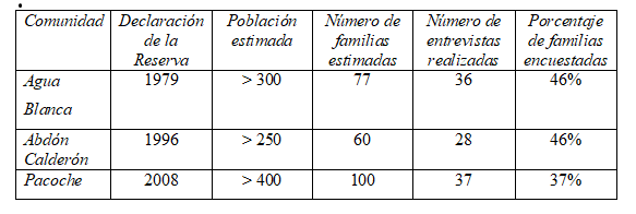 Se realizaron 36 entrevistas familiares a 23 padres y 13 madres en la comunidad de Agua Blanca, 28 entrevistas a 19 padres y 9 madres en la comunidad de Abdón Calderón y 37 entrevistas familiares a 21 padres y 16 madres en la comunidad de Pacoche (Cuadro 1). Dentro de este número se incluyen las entrevistas y los viajes de acompañamiento con informantes clave que son apicultores, agricultores, conocedores de plantas medicinales y ganaderos.
