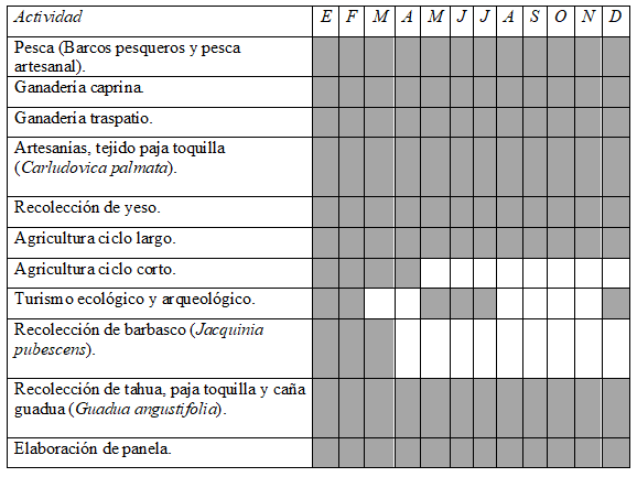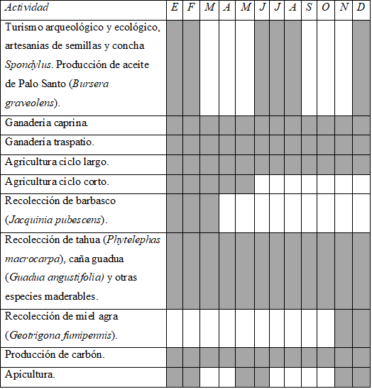 Las restricciones impuestas por el mae y las ap, impiden la práctica de actividades que se realizaban ancestralmente, se contraponen a las costumbres y afectan la subsistencia. En el pasado la cacería, la pesca, la elaboración de carbón, la corta de madera, fueron las actividades principales de subsistencia. En todas las comunidades se mencionó la importancia del rescate de actividades antiguas, como la cacería; en Agua Blanca la recolección del algodón del ceibo (Ceiba trischisandra) para colchones y almohadas; en Pacoche la extracción de paja toquilla (Carludovica palmata); en Abdón Calderón la recolección de palma mocora (Astrocaryum standleyanum) utilizada para elaborar petates y sobreros. El rescate de estas actividades podría constituir el rescate de otros recursos naturales. La población de edad avanzada muestra mayor molestia por la gran cantidad de restricciones y la falta de alternativas que las contrarresten. La presión social ha modificado algunas restricciones, por ejemplo, se permite la corta de madera o caña guadua para construcción de autoconsumo; el problema es que se requieren permisos tramitados en oficinas centrales que se encuentran a varias horas de la comunidad. Algunas otras no muestran apertura alguna, la cacería está prohibida así como el uso y portación de armas. En Pacoche y Abdón Calderón no se pueden criar animales silvestres como mascotas o para alimento. Los pobladores consideran que con estas restricciones se ha perdido conocimiento sobre la vida de muchas especies de flora y fauna.