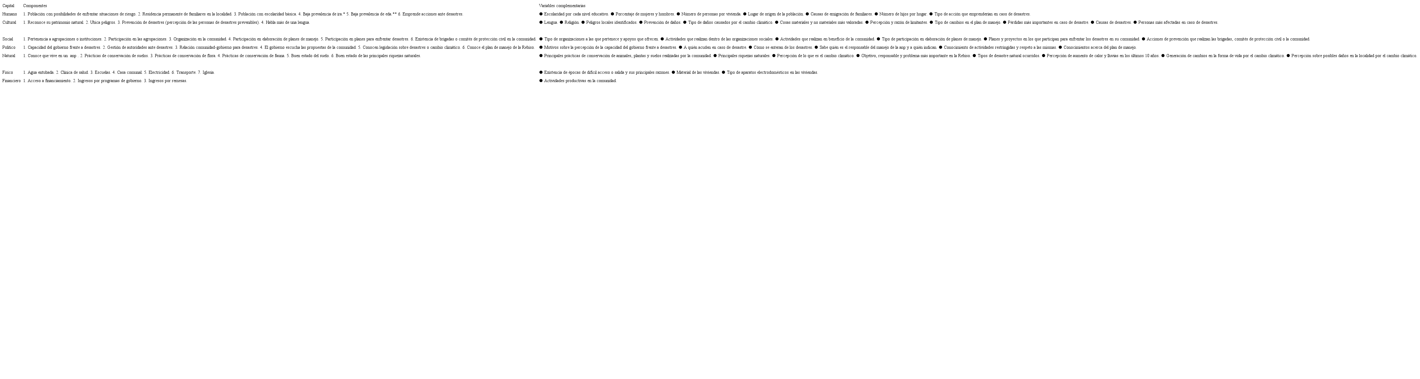 Agrupamos los 38 componentes en siete capitales,10 la descripción se resume en el Anexo 1. Por ejemplo, el capital cultural se integró por tres componentes; reconocimiento de su patrimonio natural y cultural, ubicación de peligros, y prevención de desastres (percepción de las personas de que los desastres son prevenibles). A nivel de ejemplo, las variables en la encuesta incluidas en el componente de patrimonio natural y cultural fueron: 1) lengua, 2) religión, 3) cosas materiales y no materiales más valoradas, 4) peligros locales identificados, 5) personas más afectadas en caso de desastres. Separamos los resultados de las cuatro localidades evaluadas, sin enfatizar la condición de falta de capitales, sino más bien la relación que tienen los pobladores para acceder a los capitales de su pa.