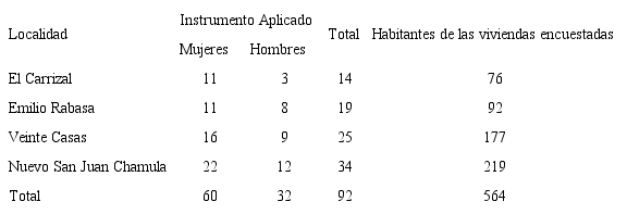 La encuesta se realizó durante el mes de septiembre del 2014. Los cuestionarios fueron respondidos en todas las viviendas existentes de El Carrizal y Emilio Rabasa y por los pobladores que se encontraron disponibles en Veinte Casas y Nuevo San Juan Chamula. Como muestra la Tabla 2, dos terceras partes de quienes respondieron fueron mujeres, el total de la información captada fue de 564 personas. El promedio de edad de la población fue de 21 años y entre los habitantes de 15 años y más el 43.1% fueron amas de casa y el 40% agricultores.