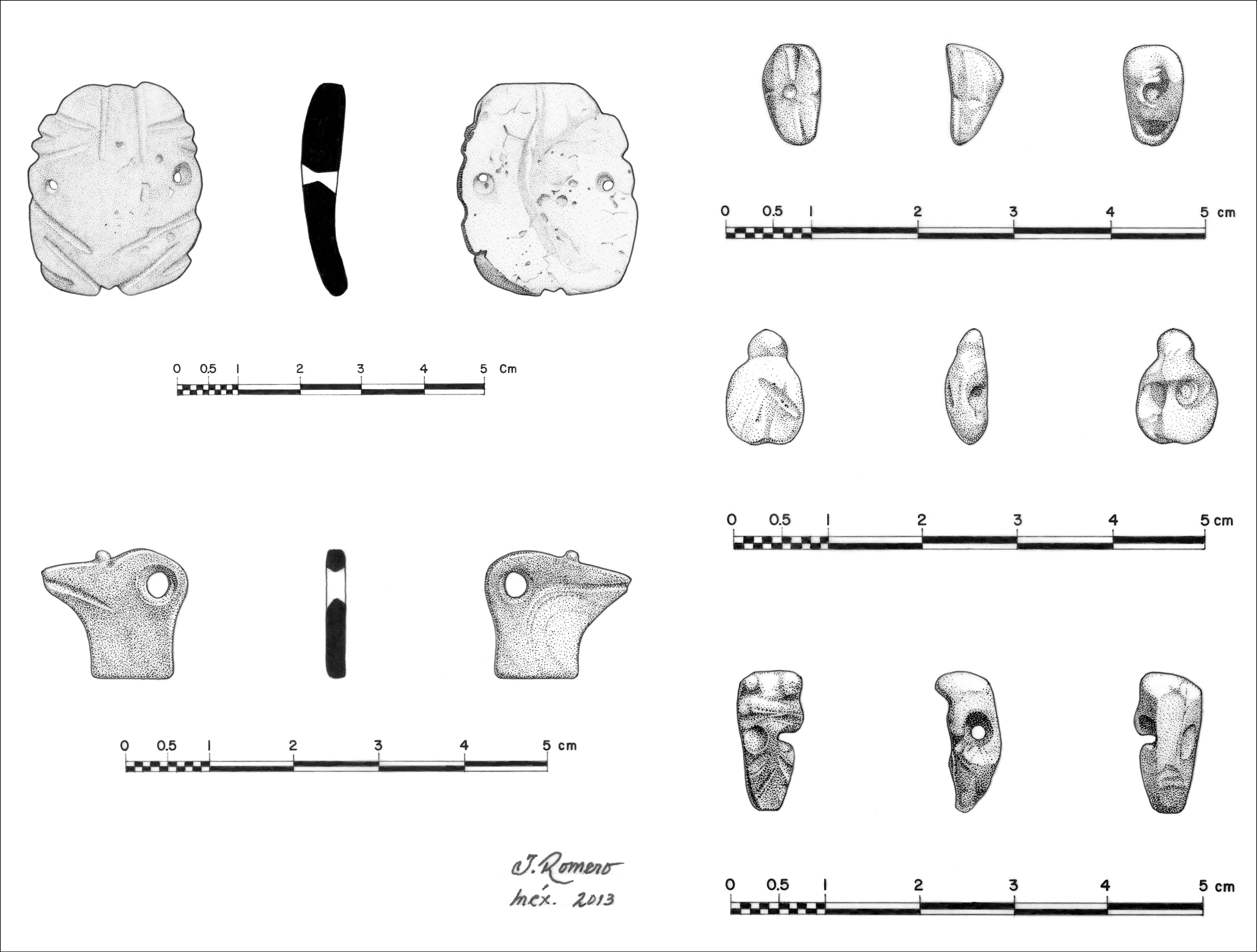 Como se mencionó anteriormente, uno de los procesos que tuvo mayor relevancia en la confección de los contornos fue el uso simultáneo de retoques (por percusión o presión) y regularización por desgaste. Fue identificado tanto para la elaboración de objetos xenomorfos circulares, ovalados, tubulares, cuadrangulares, antropomorfos, zoomorfos, etcétera. Por otra parte se determinó el empleo de procesos originales, por ejemplo, el uso de perforaciones quebradas a propósito en los contornos para dejar muescas semicirculares como parte integrante de la morfología final del objeto.