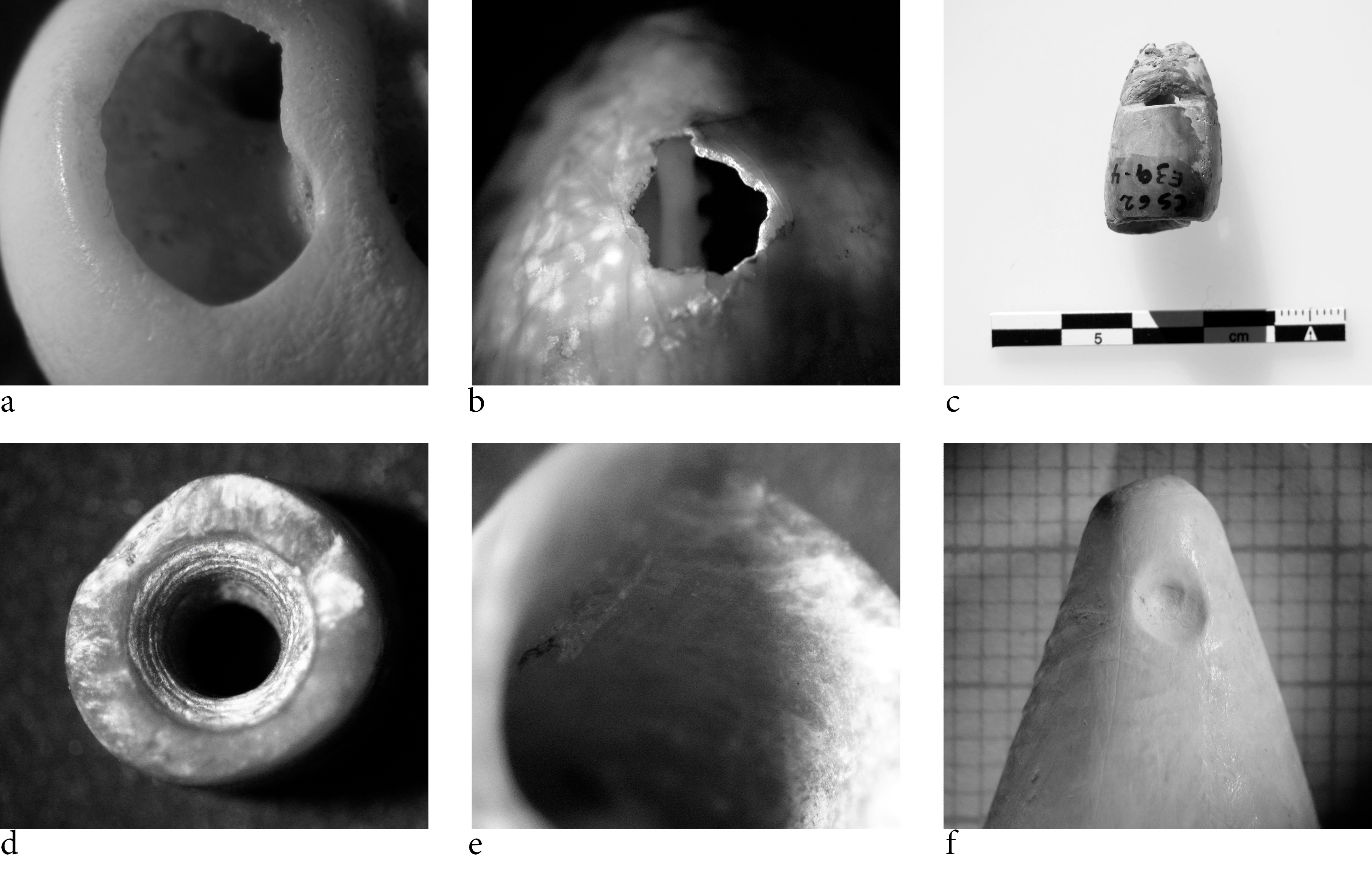 Fotografías: Élodie Mas.El registro de las huellas del volumen también contempla las perforaciones sin acabar que forman por lo general concavidades circulares. Se recopilan datos similares a los de las perforaciones completas (número, ubicación, forma, sección, estrías, técnicas). Luego, se trata de determinar si esas huellas son las de perforaciones en proceso (véase la Figura 11f) o si son ornamentales.