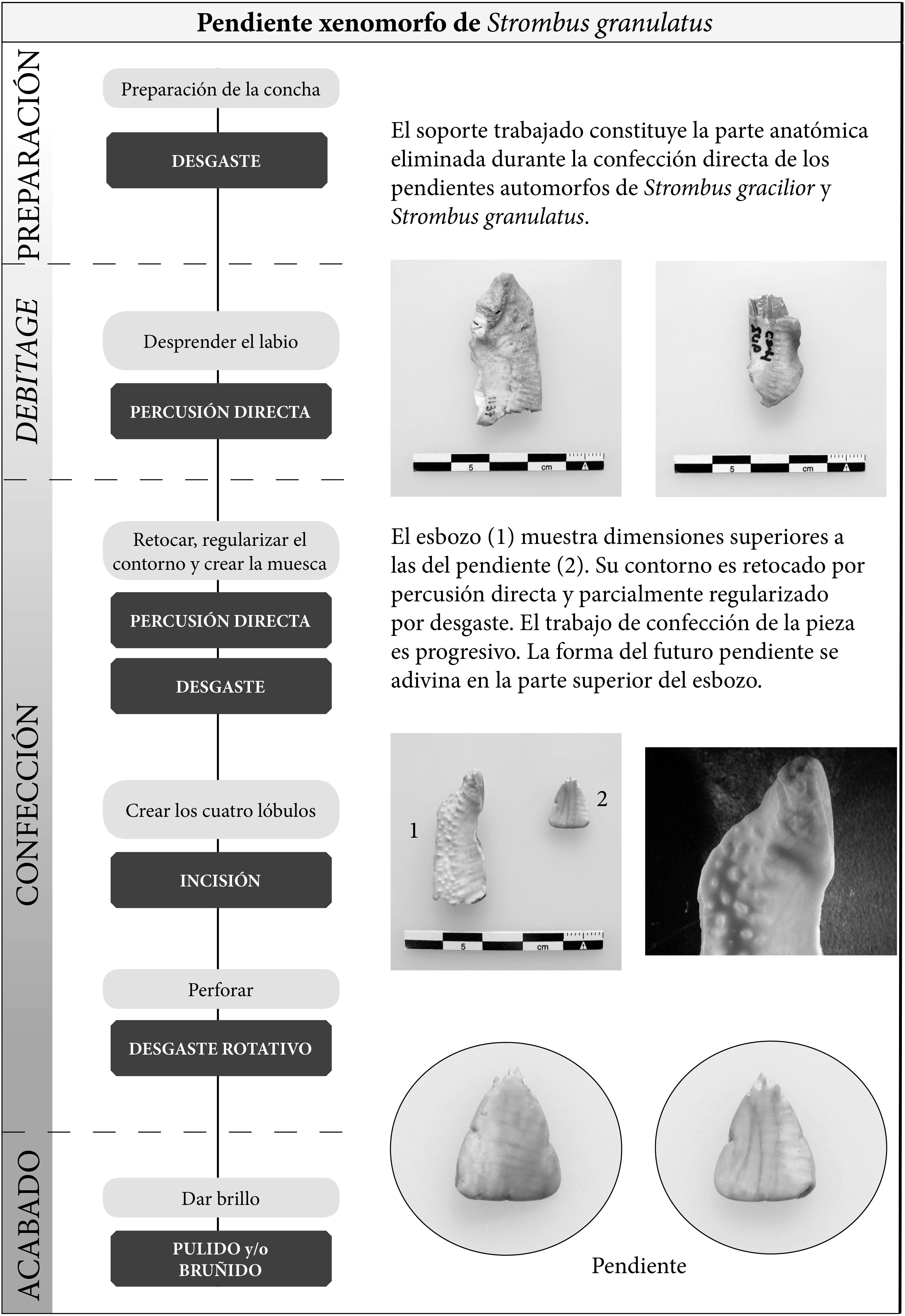 En comparación con un espécimen natural de Strombus gracilior se nota que la parte del labio fue eliminada en gran parte. Sobre el pendiente de la sepultura 1 de Cerritos Colorados, la regularización por desgaste ha borrado las huellas de esta acción; sin embargo, gracias a los esbozos presentes en las colecciones se puede proponer un desprendimiento por medio de percusión directa. El proceso podría ser completado por retoques del plano de fractura también por percusión (o presión).