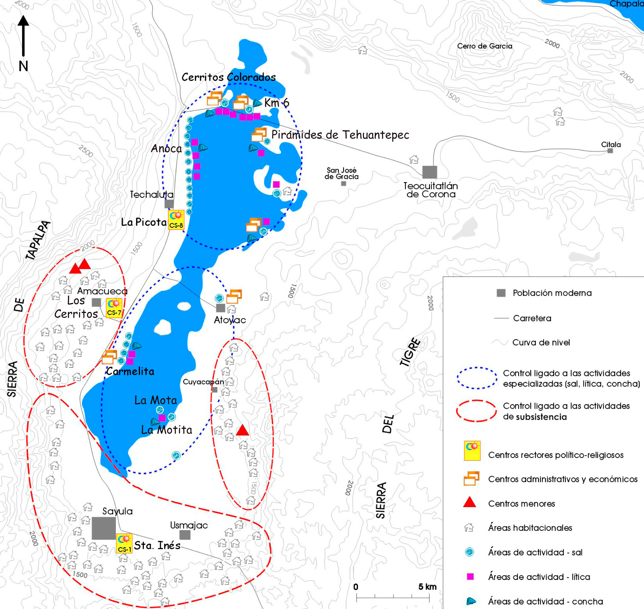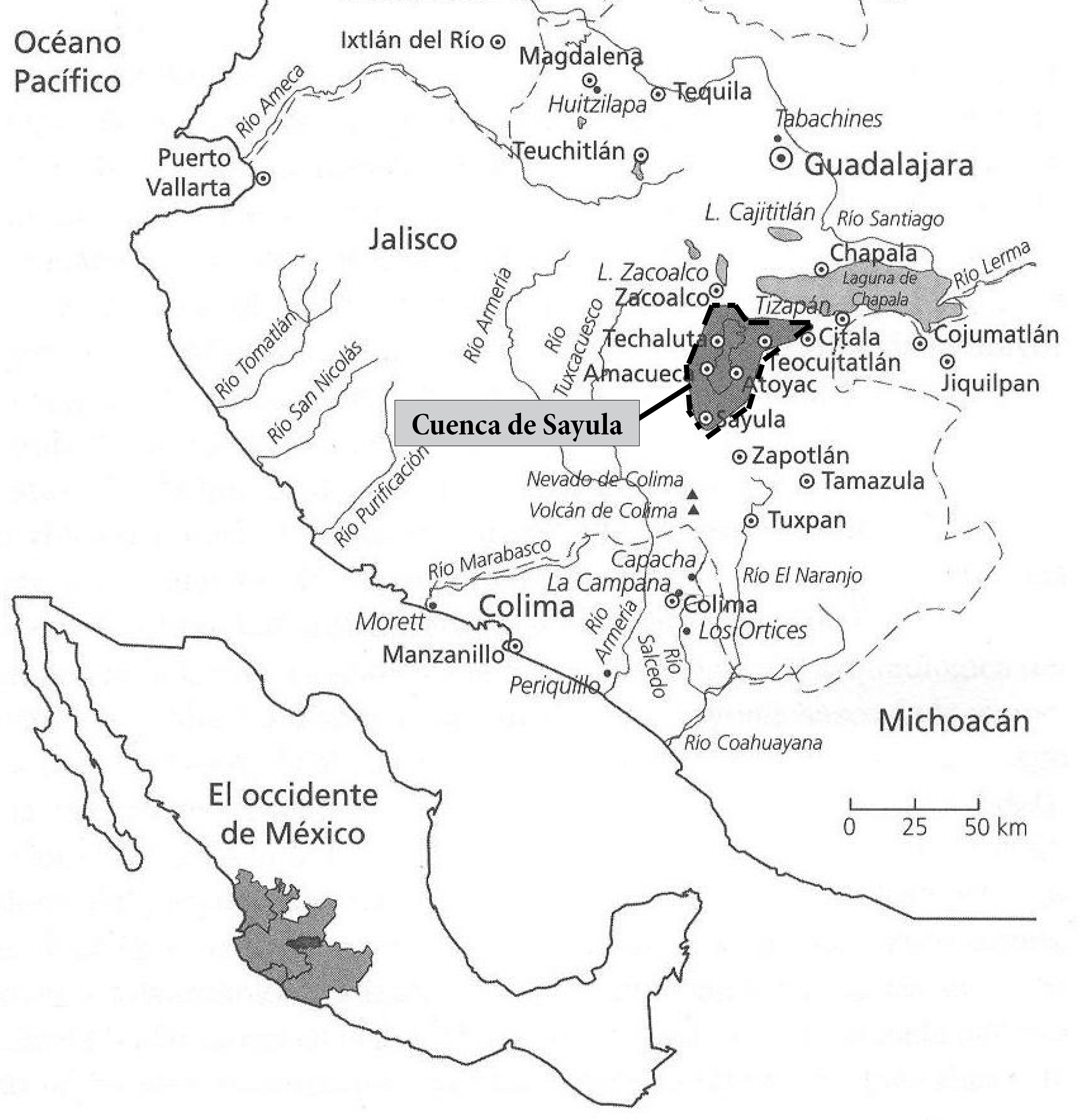 Ubicada en las tierras altas de Jalisco (véase la Figura 1), a 150 km de la costa del océano Pacífico, la cuenca de Sayula se extiende sobre una superficie promedio de 700 km² y presenta un ecosistema muy variado, particularmente favorable para la instalación y el desarrollo de grupos humanos (Liot et al., 2007: 165). El patrón de asentamiento de los sitios arqueológicos revela que las poblaciones se organizan desde 450 d.C. para aprovechar los recursos naturales (Valdez et al., 1996: 328). Su distribución en las cuatro grandes unidades geomorfológicas del territorio evidencia una organización colectiva del trabajo llevada a cabo por una población importante que participa de tradiciones comunes (Valdez et al., 2005). En aquella época, la emergencia de grandes centros rectores (véanse la Figura 2 y la Tabla 1) sugiere la existencia de grupos o sectores dominantes que controlan la adquisición, la transformación y la distribución de los recursos tanto al nivel regional como panregional (Liot et al., 2007; Valdez et al., 1996: 325). Esta fase de la secuencia cultural corresponde a un periodo de prosperidad. El factor clave del dinamismo regional reside en la localización de la cuenca en un corredor natural. Su ubicación en “cuello de botella” favorece un control de las redes de intercambio por las cuales circulan recursos naturales y productos estratégicos (Liot et al., 2007: 165; Ramírez, 2006: 154). Por otra parte, durante este periodo de auge que representa la fase Sayula (450–1000 d.C.), el potencial salino de los suelos de la cuenca es aprovechado y se organiza una producción intensiva (Liot, 2000). Los beneficios de la “industria” de producción de sal, aunados a la ubicación geográfica de la cuenca, permitieron obtener y canalizar a través del intercambio, una gama amplia de productos exóticos (Liot et al., 2007: 173), tales como la obsidiana (que proviene en su mayoría de yacimientos localizados alrededor del volcán de Tequila) y las conchas marinas (originarias de la costa Pacífica) (Liot et al., 2007). Según Liot, Ramírez, Reveles y Schöndube (2007), la concha participa plenamente en el desarrollo de la región y hasta desempeña un papel esencial en las dinámicas de intercambio.