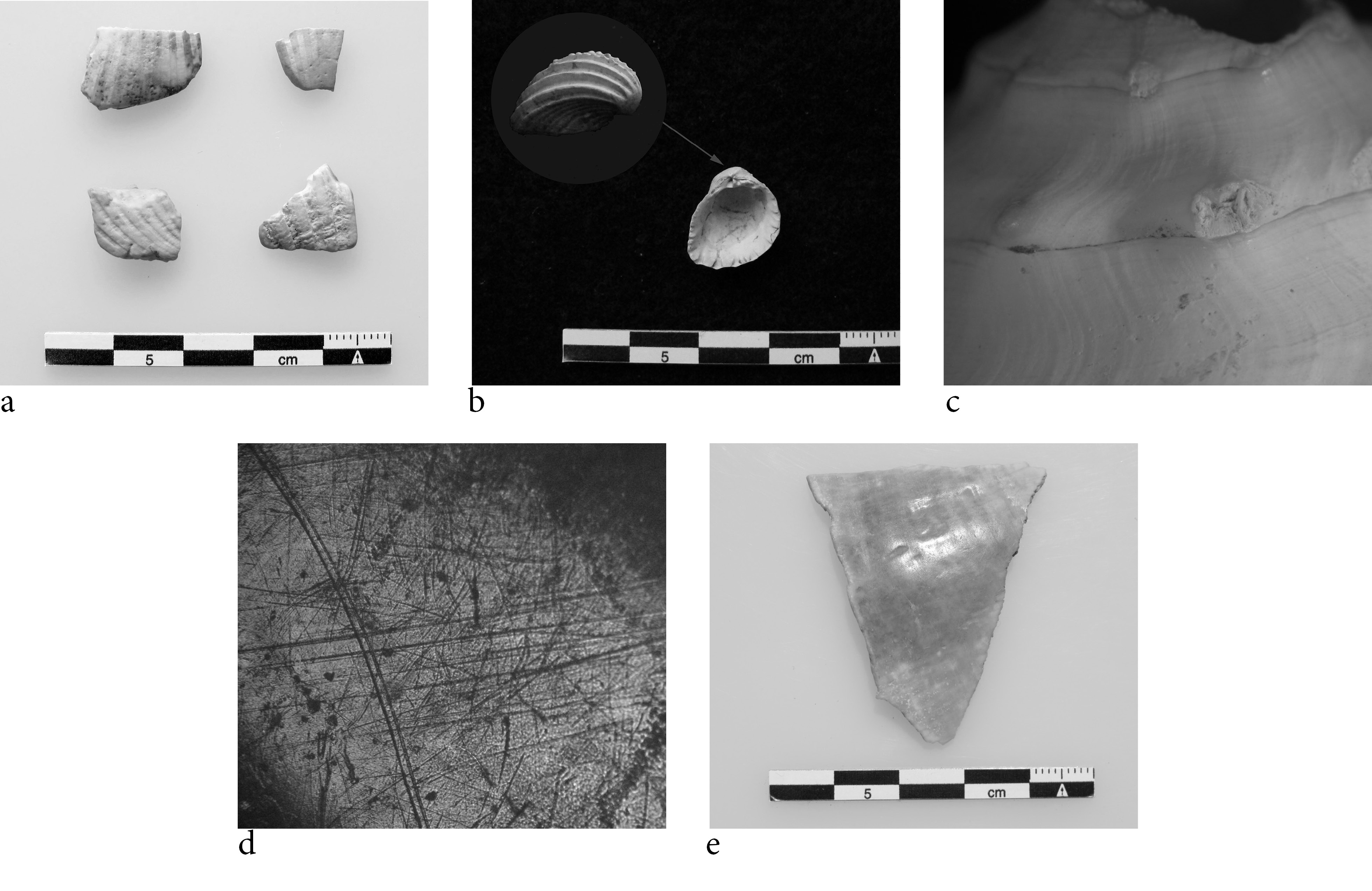 (a) por desgaste de un Polinices uber a 30X; (b) por percusión indirecta de una Cypraea arabicula a 10X; (c) por ranurado de una Oliva sp. (d) por desgaste rotativo de una cuenta circular de Spondylus princeps con una herramienta lítica a 30X; (e) por desgaste rotativo de una cuenta tubular de Spondylus princeps con un abrasivo a 30X; (f) perforación en proceso de un Conus sp.