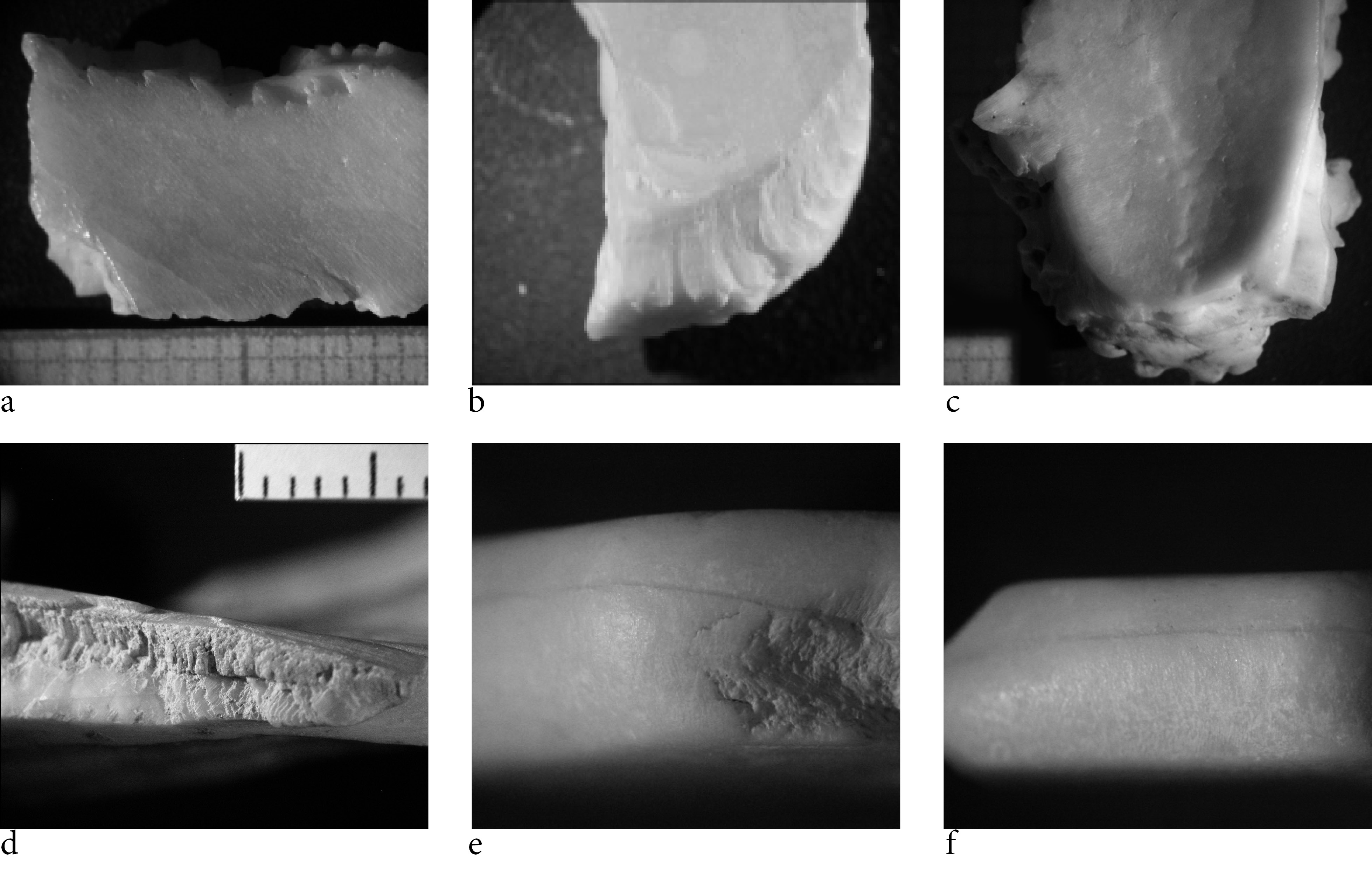 (a) Contorno astillado; (b) Huellas de desprendimiento de material; (c) Huellas de retoque de la forma; (d) Estructura cristalina aparente; (e) Estructura cristalina parcialmente borrada; (f) Estructura cristalina totalmente borrada.