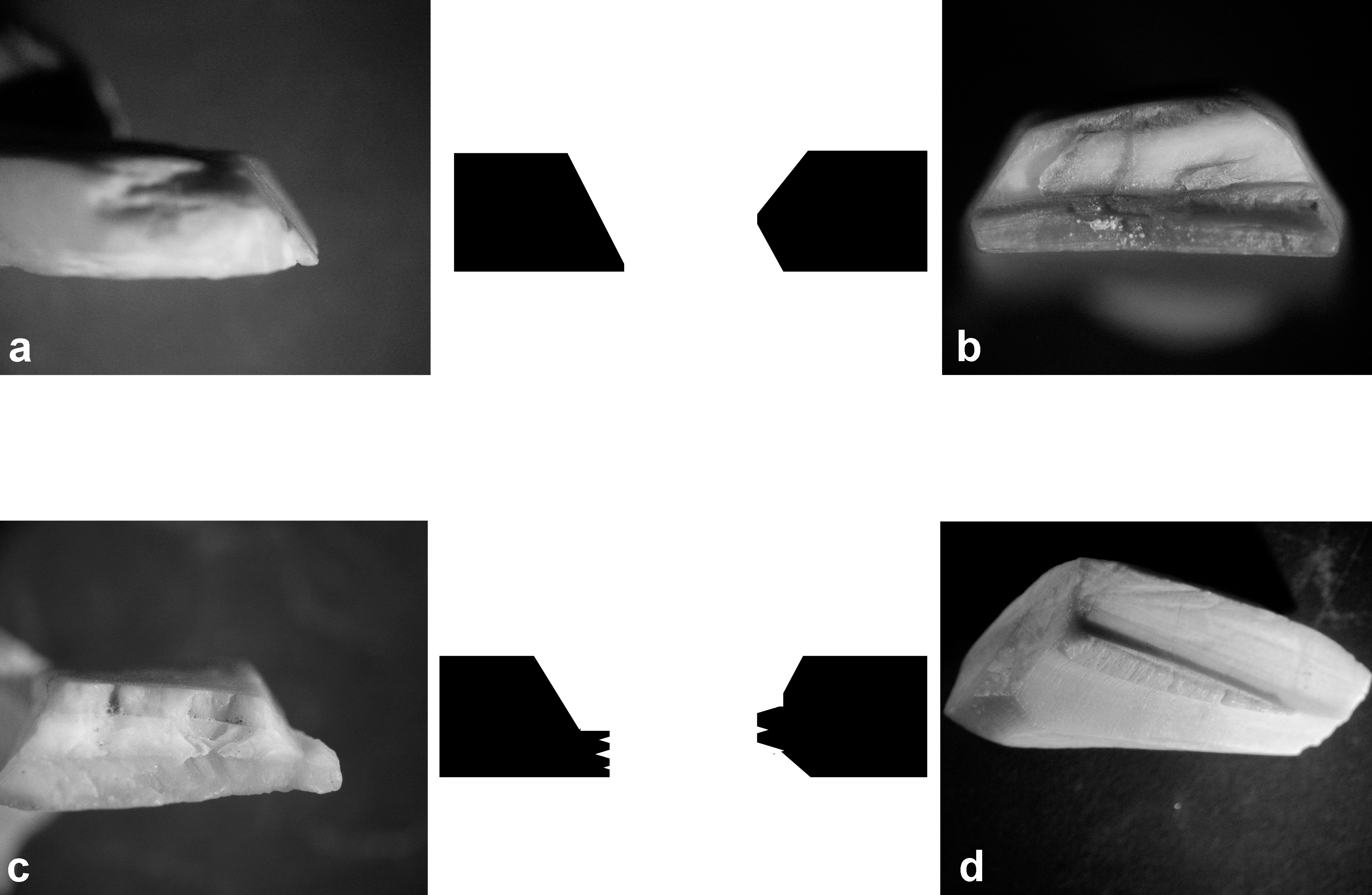 • El ranurado trabajado de forma unifacial que deja un orificio lenticular (véase la Figura 11c) y en el cual se pueden observar estrías unidireccionales así como (a veces) estrías de deslizamiento.