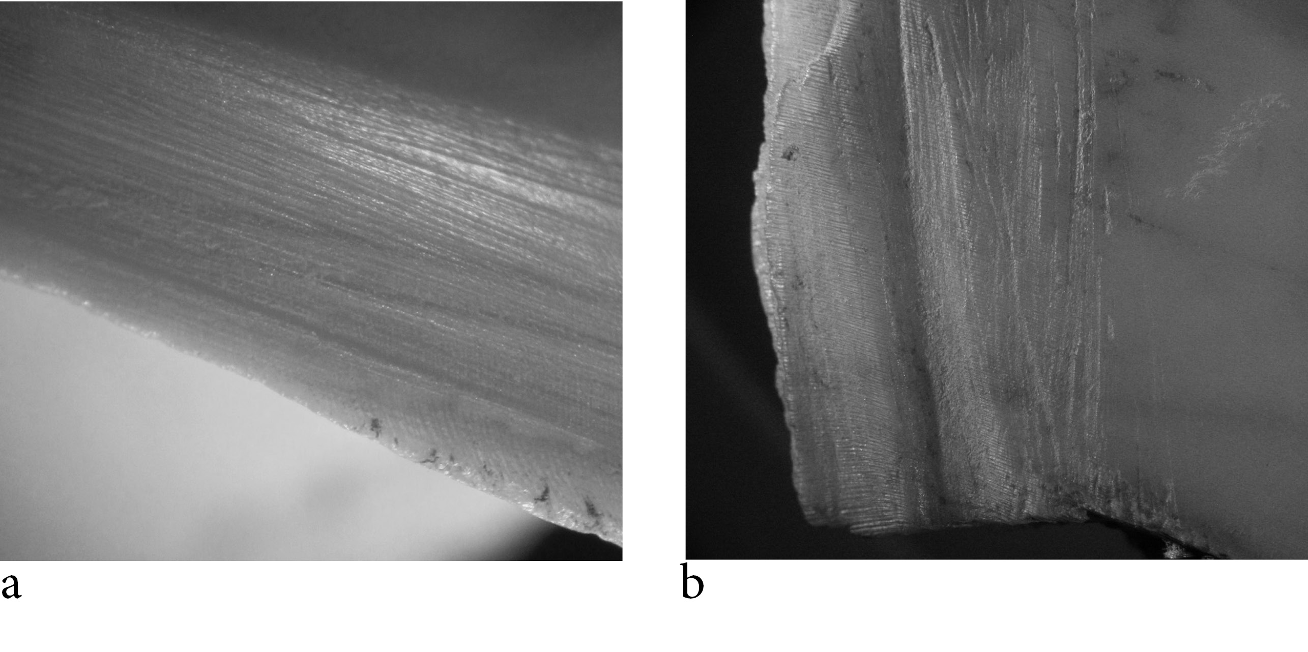 (a) Estrías unidireccionalesa 30X; (b) Estrías de deslizamiento observadas en la superficie dorsal a 10X.