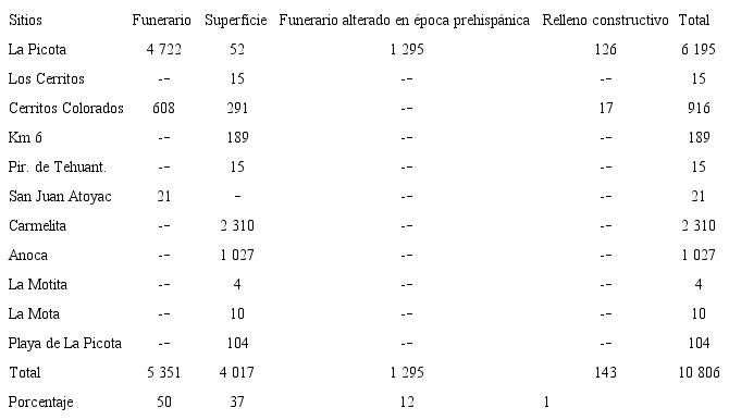 Durante dicho periodo, el material malacológico es encontrado en abundancia, no sólo disperso en la superficie de los asentamientos arqueológicos, sobre sitios clasificados como áreas de actividades (sal, lítica, concha; véase la Figura 2) así como en sitios de producción y almacenamiento, sino también en contextos funerarios, formando parte de ajuares u ofrendas mortuorias. No pudimos delimitar talleres en el espacio, al contrario, las áreas de actividades parecían extenderse de manera muy amplia (hasta 2 km), lo que sugiere una posible movilidad de los artesanos (Mas, 2018: 375). La ocupación de todos los asentamientos estudiados es contemporánea y corresponde al periodo de auge de Sayula (450-1000 d. C.). Se estudió un total de 10 806 piezas procedentes de once asentamientos ubicados en el lecho lacustre (véase la Figura 2, Tabla 1).5 Estos once sitios se inscriben dentro del patrón de asentamiento jerarquizado propuesto para la fase Sayula por Liot et al. (2007) de la forma siguiente: La Picota y Los Cerritos son clasificados como centros cívico-ceremoniales donde se concentra el poder político y religioso. Cerritos Colorados, Km 6, Pirámides de Tehuantepec, San Juan Atoyac y Carmelita representan centros de control de producción y almacenamiento, redistribución de recursos claves o estratégicos (sal, lítica, concha). Estos sitios se encuentran en los niveles de playa y/o dunas circunvecinas a ésta, junto a los talleres de producción de sal y áreas de actividad de lítica y concha. Dentro de esta última categoría se encuentran los sitios Anoca, Playa de La Picota, La Mota y La Motita.