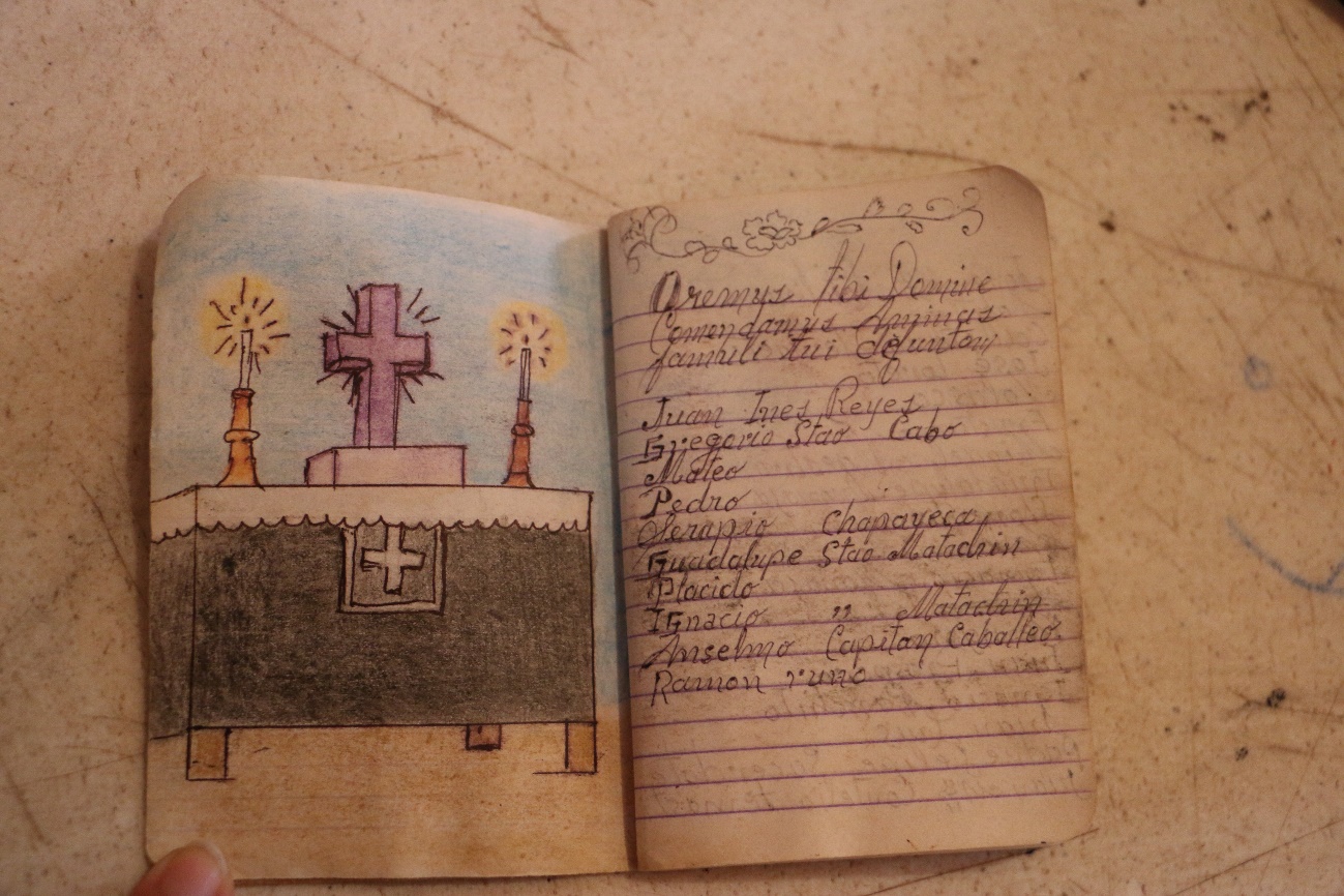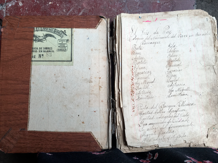 No obstante, en un momento dado, durante el trabajo de campo, me fue mostrada, sin duda ante mi insistencia en saber acerca de los libretos, una caja de madera apolillada, polvorienta y desgastada por el paso del tiempo (véase la Imagen 2); contenía siete libretos, todos manuscritos, con características, materiales y de contenido, similares a las que he descrito en el caso de Ihuatzio y de los tres documentos antiguos en lengua tarasca. Nadie supo o nadie quiso decirme precisamente a quien pertenecían estos libretos que describiré en adelante.La respuesta más común era: “no te puedo decir de esas cosas, está prohibido, pues”. Como veremos, esto se debe al modo particular en que son tratados los libretos, las prohibiciones de que son objeto. Así que por el momento no me queda más que aventurar que esta caja con estos libretos, que tienen huellas que revelan mucha antigüedad, bien pueden ser parte del repertorio de uno de los tres maestros de pastorela de Comachuén.