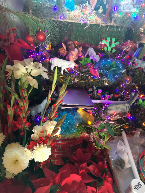 Comenté más arriba que en Comachuén se utiliza una caja de madera para guardar los libretos. Ahí deben permanecer, fuera del alcance de las miradas, no se les puede extraer por ningún motivo sino hasta que llega la fecha en que comienzan los ensayos de la pastorela. Por lo general, esto sucede después de la celebración de muertos o el 12 de diciembre. En Ihuatzio, el libreto permanece en el mismo lugar donde se guardan las pertenencias del Niño Dios, tales como su amplio ajuar de decenas de trajes, sus elementos distintivos –su sillita, sus zapatos− sus juguetes, fotos y cartas –a modos de exvotos− y demás objetos que se le ofrecen a cambio de los favores recibidos, los milagros que se le atribuyen. Al igual que en Comachuén está prohibido, en ambos barrios de Ihuatzio, mostrar el libreto a los fuereños. ¿Cómo entonces pude observar lo que estoy describiendo? Como medio para ganar la confianza de las personas y para que me permitieran asistir a los ensayos, se me ocurrió ofrecer un cesto de mimbre con algunos alimentos como café, chocolates y galletas; sugerí que podían repartirlos entre quienes participan en dichos ensayos (el carguero del Niño Dios, el ensayador, los músicos y los muchachos que interpretan los diferentes personajes). Lo primero que hicieron fue colocar el cesto a modo de ofrenda en el altar; me dijeron “es para el Niño Dios ¿verdad?, lo trajo para él, mire ahí lo dejamos”. Pude percatarme que el libreto había sido colocado ahí entre las flores y las velas (véase la Imagen 5). Al año siguiente hice lo mismo, ofrecí galletas, café, azúcar… y al siguiente también. Creo que así me gané el “derecho” de asistir a dos momentos cruciales de un ritual devocional. El primero consiste en extraer de un baúl de madera cada una de las pertenencias del Niño Dios, colocarlas luego en sus respectivos lugares en el altar de la casa del carguero en turno y vestir al santo Niño con un trajecito nuevo. El segundo consiste en, una vez terminado el periodo de representaciones de la pastorela, guardar con el mismo cuidado todos estos elementos, para no volver a extraerlos sino hasta el año próximo. Entre otras cosas, pude observar que el cesto que ofrecí formaba parte ya de dichas pertenencias, pues lo extrajeron del interior del baúl y luego, pasada la temporada de representaciones de la pastorela, lo volvieron a guardar con mucho cuidado, al igual que el libreto y las demás pertenencias del Niño Dios (véase la Imagen 5).