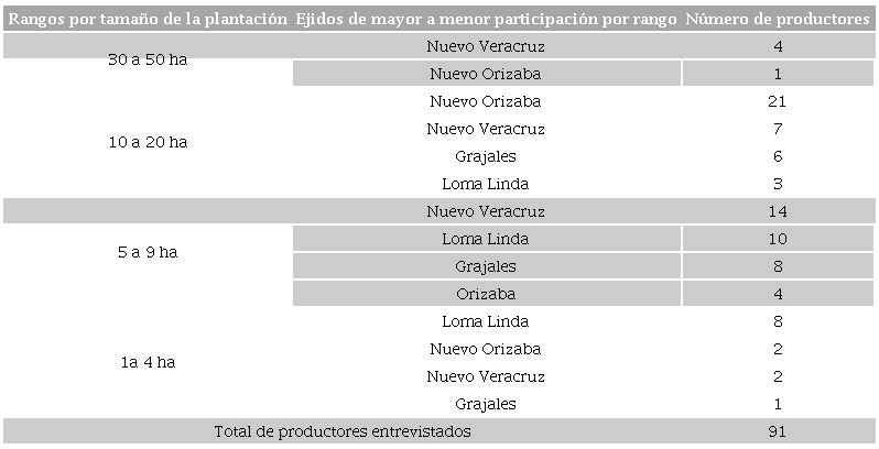 Respecto a la palma, además debe mencionarse que la instalación de un vivero en el ejido Nuevo Orizaba y el acceso a las plantas de palma, a ningún costo o a uno muy bajo, permitió que ejidatarios con distintas posibilidades económicas establecieran las primeras plantaciones entre el 2009 y el 2013. De acuerdo con los 91 entrevistados, se sabe que la mayoría de las plantaciones datan de este tiempo y que los segmentos más numerosos son los que reúnen a productores con diez a veinte hectáreas (37) y a productores con cinco a nueve hectáreas (36). La mayoría de las plantaciones que tienen entre treinta y cincuenta hectáreas y entre una y cuatro hectáreas datan de fechas más recientes, empezando por aquellas establecidas en el 2014 y el 2016, seguidas de las establecidas entre el 2017 y el 2018 (véase tabla 2). Esto se produjo como parte de la segunda etapa de expansión del sistema productivo, donde las empresas privadas juegan un papel dominante. Algunas plantaciones jóvenes provienen de viveros instalados por líderes locales con recursos públicos y otras, de los viveros de las empresas. Estas últimas corresponden a ejidatarios con capacidad de endeudamiento, quienes adquieren créditos con financieras rurales y acuerdos de exclusividad con las empresas.