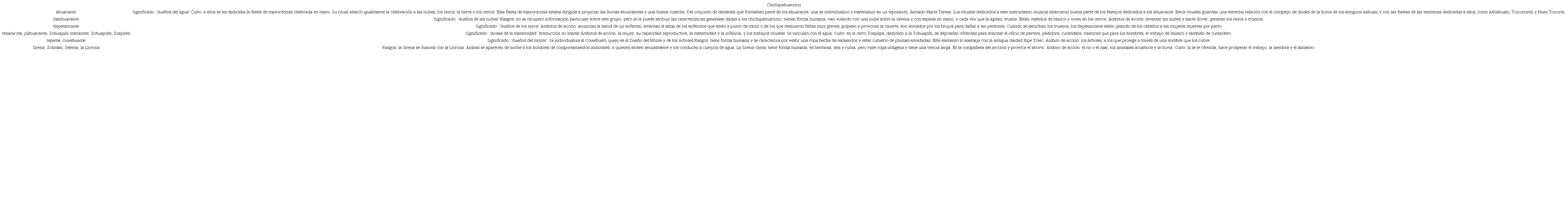 Existe un desfase insoslayable entre oralidad y praxis. Buena parte del repertorio ritual ha dejado de implementarse, y, con ello, las celebraciones que se realizaban para propiciar a los distintos grupos de chichipahuatzitzi, quienes aseguraban el buen destino de la siembra. No obstante, el recuerdo de estos seres se ha mantenido vivo en la mente de algunos xolotecos, por lo que la tradición oral ha seguido teniendo una vía de reproducción en la comunidad, como ha ocurrido a lo largo de casi quinientos años. El panteón sagrado que animaba los rituales en torno a la siembra se concentró en el agua y en los elementos naturales vinculados a esta: las nubes, los rayos y los cerros. De esta manera, se constituyeron grupos definidos de seres como fueron los ahuacante, mexhuacante, tlapetancame y tepeme. Esta especificidad, no obstante, termina siendo un criterio metodológico más que la realidad xoloteca, y pahuateca, en general, pues todos ellos actuaban en conjunto y en bloque conformaron los chichipahuatzitzi.