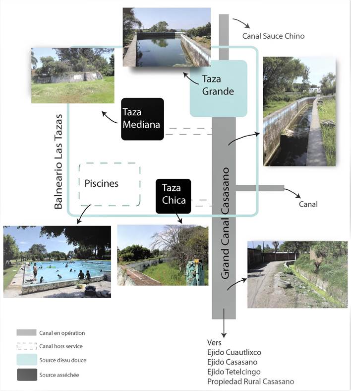 Le grand Canal Casasano prend naissance dans le réservoir de la Taza Grande, il reçoit les eaux de la Taza Chica, traverse les terres des ejidos Cuautlixco et Casasano et la raffinerie de canne à sucre La Abeja, qui utilisait la force motrice de l’eau pour faire fonctionner son pressoir. Puis il irrigue les terres de l’ancienne Hacienda de Casasano, aujourd’hui Propriété Rurale de Casasano. Le canal a la particularité de présenter dans sa partie initiale une légère contrepente (Ávalos et Palerm 2003), mais jusque dans les années 1980, le débit de la source Las Tazas était tel que cette situation n’empêchait pas d’acheminer l’eau par gravité jusqu’aux terrains agricoles.