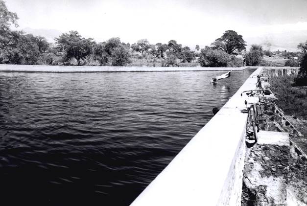 Comisión Nacional del Agua-Archivo Histórico del Agua, Fondo Colección Fotográfica. 1963. Hombres nadando en el tanque de almacenamiento, Vista parcial, Casa Grande de Casasano. Caja 25, expediente 7072. Cuautla, Morelos.