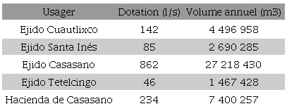 La formation de ce réseau d’irrigation remonte à la fin des années 1920. Avant la Révolution, la source Las Tazas servait à l’irrigation des terrains de l’Hacienda de Casasano. Les propriétaires de l’hacienda firent construire un barrage au niveau des sources pour retenir l’eau et l’utiliser pour l’usage agricole. Les terres de l’hacienda, particulièrement fertiles pour la culture de la canne à sucre, furent redistribuées aux paysans après la Révolution, et avec elles, l’eau qui était utilisée pour irriguer les terrains. En 1926, la Secretaria de Agricultura y Fomento (SAF) publie un règlement sur la distribution des eaux dans le bassin de la rivière Cuautla, qui attribue aux ejidos Santa Inés, Casasano, Cuautlixco et Tetelcingo un volume d’eau de 1135 lps de la source Las Tazas pour l’usage agricole et aux propriétaires de l’hacienda 234 lps (figure 3).