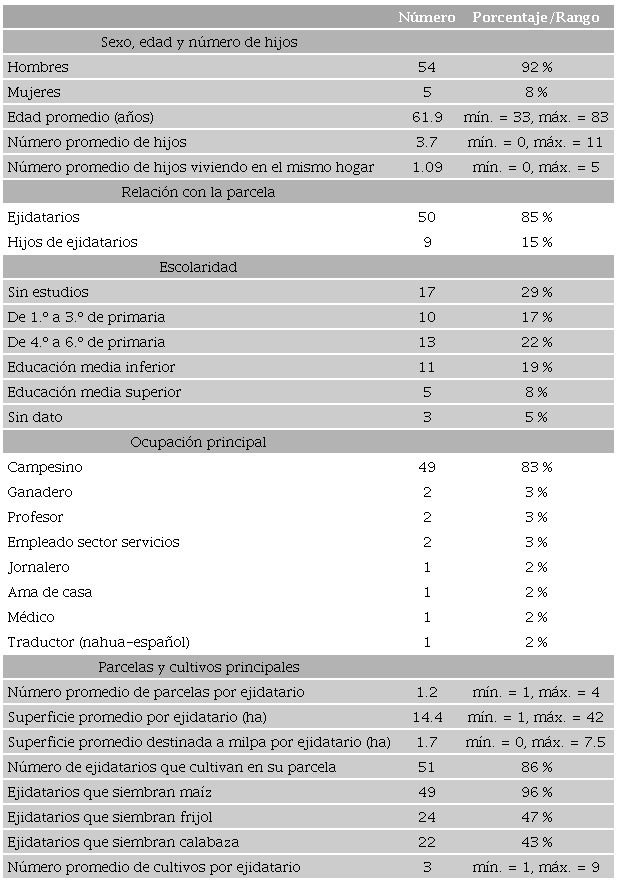 Durante el trabajo de campo del 8 al 30 de julio de 2019, se encuestó a 59 ejidatarios con el fin de comprender las tendencias de las vulnerabilidades socioambientales, culturales y económicas de las familias campesinas. En la tabla 1 se muestran las principales características de los agricultores entrevistados. La selección se basó en una lista de familias que previamente habían sido entrevistadas, entre 1995 y 1998. La información se organizó en bases de datos, los datos cuantitativos se procesaron en Excel y los cualitativos se sistematizaron por temas. Además, se entrevistó a autoridades ejidales y municipales, y a varios ancianos y ancianas. Las entrevistas, para su análisis, se codificaron por temas.
