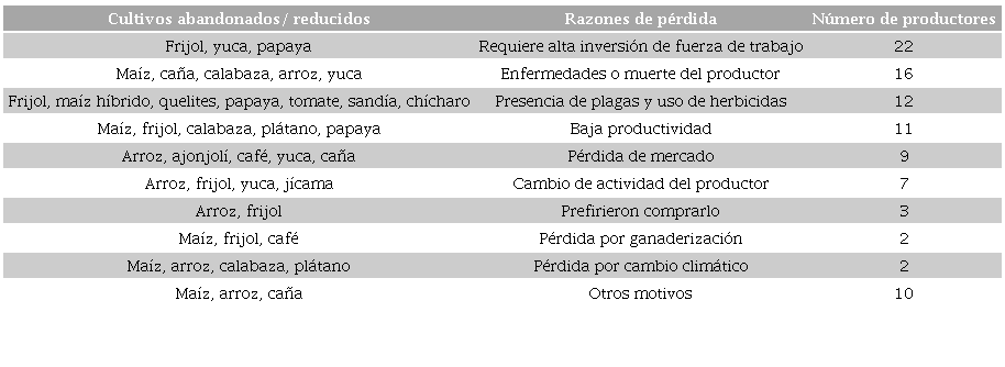 Las causas más importantes para abandonar un cultivo son la alta inversión de trabajo, la presencia de plagas, el uso de herbicidas, la poca productividad y los precios bajos que no permiten recuperar los costos de producción. Ante estas limitantes, los ejidatarios mayores se desaniman y renuncian a sembrar varios cultivos, a pesar de su gusto por consumirlos. Con la pérdida de cultivos se resquebrajan conocimientos agrícolas y ambientales. Los ancianos no solo cumplen con la función de acumulación y distribución de los conocimientos, sino también son los depositarios de la experiencia colectiva agraria. Ellos mantienen una rica variabilidad genética de los maíces cultivados y los conocimientos asociados. Cuando se decide no cultivar una especie o variedad, se pierden los conocimientos englobados en el sistema milpero: resistencias a plagas, vientos o sequías; asociación de cultivos para el manejo de plagas; rotación; ciclos de regeneración de la vegetación y el cultivo para la recuperación de fertilidad, y cacería como control de fauna que se alimenta de la milpa. Estos conocimientos se diluyen cuando se deja de cultivar la agrobiodiversidad.