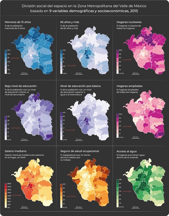 Así pues, el análisis aquí llevado a cabo pretende, en primer lugar, proponer una lectura agregada de las divisiones socioespaciales metropolitanas con datos recientes. En segundo lugar, busca establecer el vínculo con las geografías de la movilidad. Nuestra investigación se propone, en consonancia con los trabajos anteriores (Duhau 2003; Mera 2014; Valette 2019), situar los esquemas de movilidad en las grandes líneas de la geografía social de la ZMVM, pero, sobre todo, proseguir en el análisis de la división socioespacial con la movilidad.