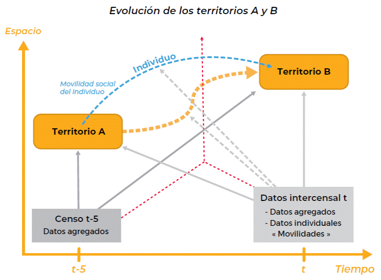 Estudiar los esquemas territoriales por las dinámicas que los producen constituye el núcleo de este artículo. Aunque el censo es la fuente de datos más completa para describir una población en un momento dado en un territorio determinado, la información que contiene resulta muy limitada desde un punto de vista sociodemográfico y necesita enriquecerse con otras fuentes. No obstante, la encuesta intercensal permite tomar y analizar de manera geolocalizada información sobre la movilidad residencial y cotidiana de la población.