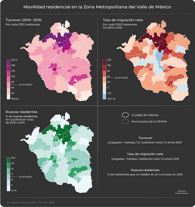Más allá de los territorios con mayor atractivo para la movilidad residencial, pueden leerse otras polaridades. Respecto a los municipios que registran más salidas, destaca el centro-este, popular y denso. Los municipios pericentrales populares en proceso de saturación (Ecatepec, Iztapalapa o Nezahualcóyotl), con un saldo muy negativo, dan cuenta de «estabilidad» de la población residente, incluso de falta de atractivo. Asimismo, el peso del saldo migratorio en la población total (en la fecha de llegada) muestra efectos de repulsión del centro- periferia oriental y, a la inversa, de atracción en las periferias, al este, pero sobre todo al noreste. Por ejemplo, la tasa de migración neta es de -33 ‰ en Ecatepec y Neza. Por último, también puede leerse el dinamismo acentuado del centro-oeste con la densificación de la CDMX (entre 2010 y 2015, la entidad capitalina ganó 70 000 habitantes, mientras que hasta la década de 1990 los estuvo perdiendo): el centro conoce un gran turnover (superior al 120 ‰, cuando la media metropolitana es del 80 ‰), al igual que la periferia norte.