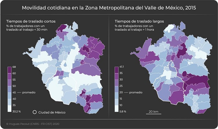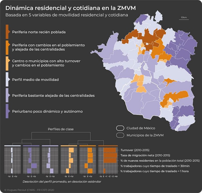 Abstract: In the Mexico City Metropolitan Area (MCMA), as in most Latin American metropolises, intra-urban mobility is the main driver of changes in the social division of space. The dynamics of residential mobility, as well as commuting, strongly reflect the inscription of inequalities in urban space. However, these dynamics operate on different time scales and their analysis is often limited to only one type of mobility at a time. The aim of this article is precisely to reconcile the analysis of residential mobility with that of everyday mobility, each of which sheds light on the socio-spatial division of the metropolis in its own way. Using data from the 2015 intercensal survey, this article proposes to elaborate a sociospatial typology of the territories of the mcma, at the municipal level, linking the dynamics of daily and residential mobility with the territorial contexts understood by the characteristics of the inhabitants.