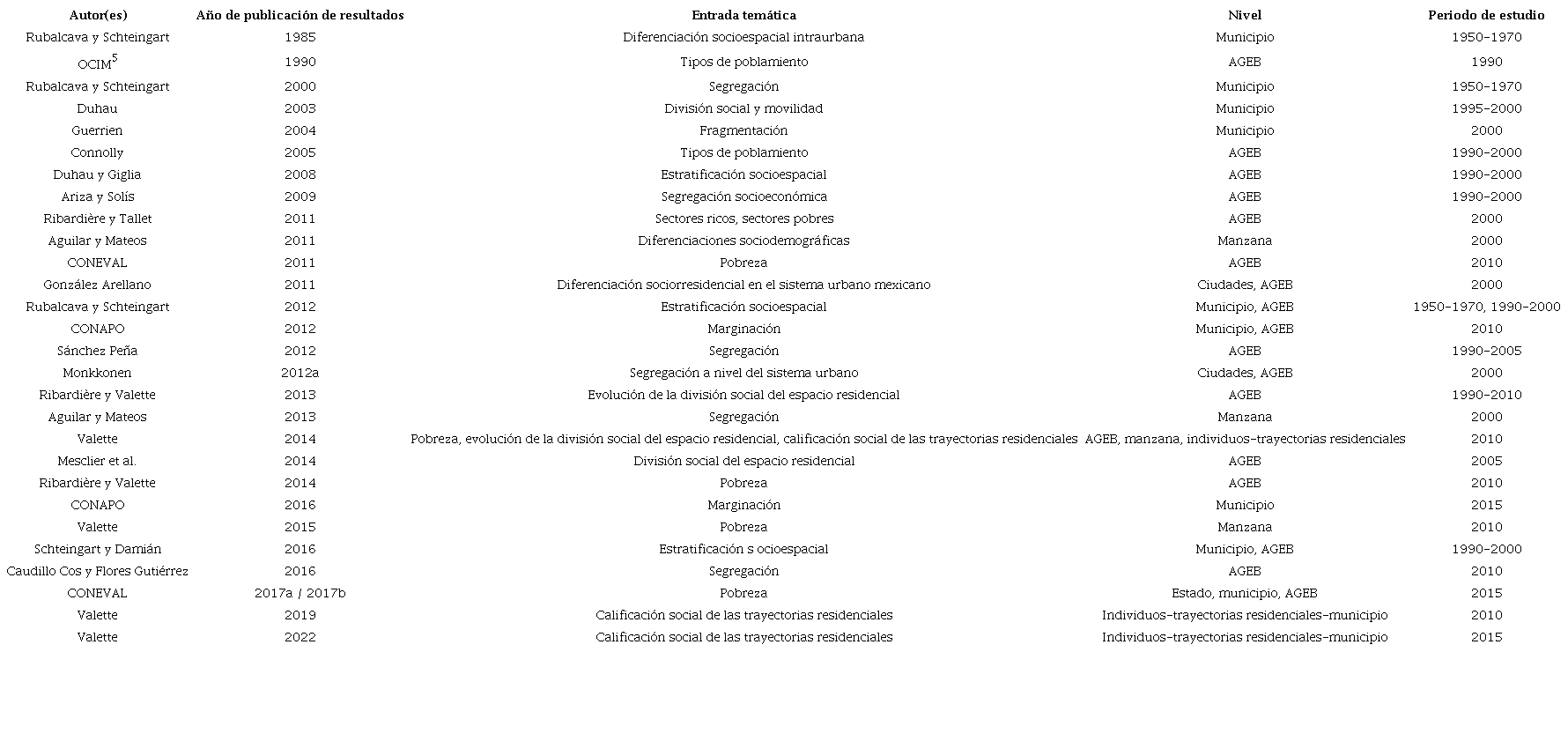 En investigaciones científicas geográficas anteriores, ya se han destacado ampliamente los patrones generales de la división social del espacio de México dando prioridad a diferentes entradas temáticas (segregación, pobreza, fragmentación, etcétera). Estos análisis se hicieron según los diferentes niveles geográficos disponibles en las publicaciones de datos censales (entidades federativas, municipios, áreas geoestadísticas básicas -AGEBS-, manzanas) (véase tabla 1). El objetivo en el planteamiento seguido en este artículo es interesarse por la división social del espacio como una manera de leer tantos contextos sociodemográficos y económicos diferentes. En estos contextos, se registran los movimientos de población, a escalas temporales largas y cortas que marcan el ritmo del pulso de la ciudad. A su vez, estos contextos también pueden ser rediseñados por la movilidad urbana. Nuestro enfoque considera, de este modo, la división social del espacio como la inscripción espacial de las discontinuidades sociales, en sus formas y procesos, y en las diferenciaciones urbanas que pudieran resultar.