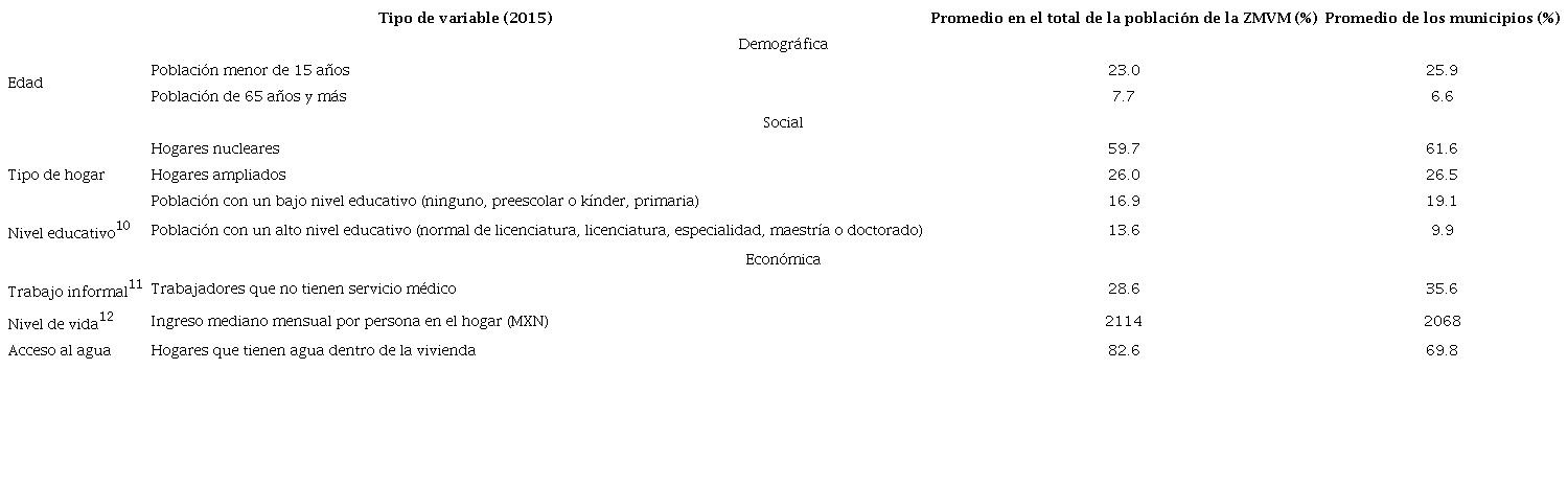 Pretendemos así acercarnos a la división social de la ZMVM a partir de las características de sus habitantes. Para ello, hemos movilizado los datos de la encuesta intercensal más reciente (INEGI 2015) a nivel de los municipios.7 Hemos seleccionado en esta encuesta un conjunto de variables que nos permiten aproximarnos a las desigualdades urbanas según tres dimensiones: demográficas, sociales y residenciales (véase tabla 2). De este modo, hemos tomado de entre las variables presentes en la encuesta de 2015, a pesar de las limitaciones que ofrecen, un conjunto de dimensiones utilizadas tradicionalmente en los trabajos citados con anterioridad (véase Tabla 1). Estas dimensiones son transversales a los análisis sociológicos y geográficos de la sociedad mexicana, realizados por las instituciones oficiales nacionales e internacionales (CONEVAL 2017a, 2017b; CONAPO 2016; PNUD 2010) y en la literatura científica. Para ello, se han tomado