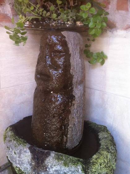 Las monedas suelen ser arrojadas al interior de una improvisada fuente de piedra de andesita donde fue depositada la escultura, la cual permanece sumergida parcialmente en agua,4 además de caerle un ligero pero constate hilo de agua que mana de la parte superior, donde se le instaló una toma escondida entre las hojas de una planta colocada en una pequeña maceta, la cual sirve como recipiente donde los visitantes suelen dejar también la referida ofrenda económica (véase fig. 2).