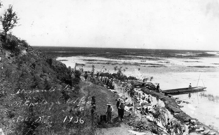 El paraje como tal ofrece una serie de características propias que le hacen relevante no solo para los fines de este ensayo, sino también para la historia del lugar, sobre todo porque se relaciona con el testimonio comunitario que afirma que en dicho lugar existió un manantial que vertía con fuerza y contundencia el vital líquido hacia la ciénaga. Dicha fuente dio el nombre a la comunidad de Almoloya, ‘lugar donde remolinea el agua’,6 según se afirma localmente, en relación con la contundencia y capacidad aportadora de agua, lo cual hizo de este paraje uno de los lugares de referencia histórica más importantes del poblado. A pesar de ello, la necesidad que implicó cubrir la demanda de agua potable de la Ciudad de México para los años treinta del siglo XX obligó al gobierno federal a entubar el manantial afectando de manera irreversible este referente identitario de trascendencia histórica.