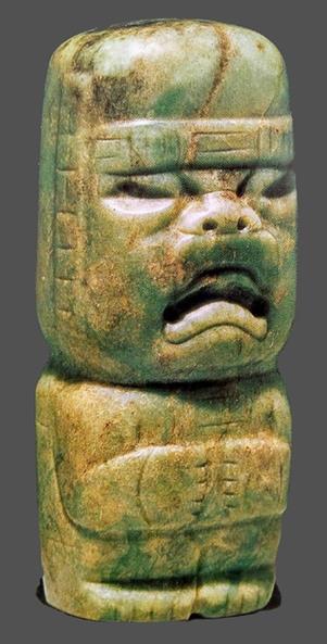 En esa línea la muestra denota un grado de asociación conceptual con otras netamente olmecas, partiendo de los rasgos iconográficos generales, que incluyen postura, expresión y disposición volumétrica general. Al respecto, algunos ejemplos destacables son las denominadas esculturas tipo hacha típicamente olmecas y distribuidas panregionalmente desde el golfo de México hasta el centro del país. Dichas representaciones, de acuerdo con De la Fuente (1994), muestran la típica convención olmeca: «de enorme cabeza fantástica y cuerpo sumamente abreviado y reducido en sus rasgos esenciales» (22), en ellas reconoce representaciones de seres fantásticos de carácter antropomorfo relacionados con el agua, la fertilidad y la agricultura, interpretándolos como dioses del agua y la fertilidad. Dichas muestras llevan los ojos entrecerrados, la nariz chata y la enorme boca de labios gruesos vueltos hacia arriba formando una suerte de trapecio y con las comisuras hacia abajo (22). Otro aspecto que vale la pena mencionar de la propuesta descriptiva de Beatriz de la Fuente se enfoca en «el casquete» ceñido en la cabeza (véanse figs. 6 y 7), el cual también se encuentra sugerido en la pieza de Almoloya, solo que este último se pierde en la caracterización de las cejas.