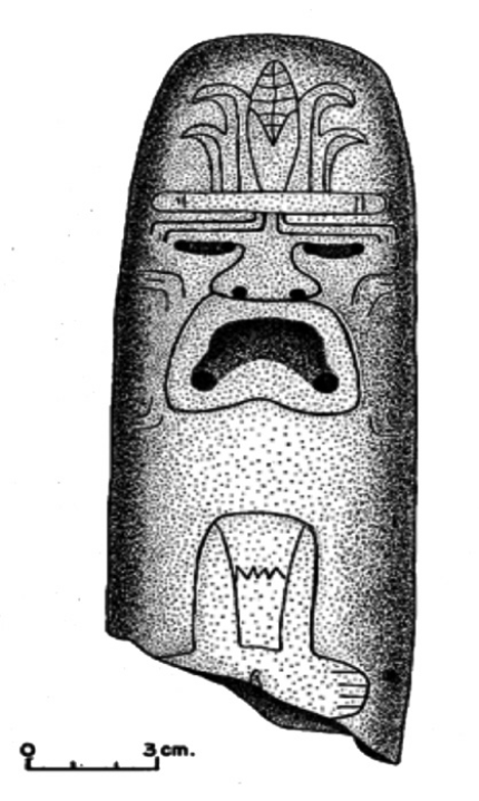 El área o sección destinada a los ojos, cuya forma es notoriamente alargada, fue realizada en bajorrelieve. Por debajo de esta sección, sobresalen los pómulos notoriamente marcados por una franja que los une escultóricamente con nariz, boca y cejas. Al igual que las cuencas oculares, la horadación referida a la boca conserva un alargamiento horizontal cuyos márgenes redondeados buscan representarla en posición abierta.