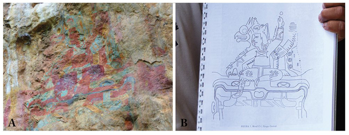 Cette montagne et cette grotte sont considérées aujourd’hui comme doublement sacrées, comme pourvoyeuses de vie à travers le trésor liquide qu’elles renferment et de par leur origine olmèque. Elles matérialisent dans le monde présent la présence passée des premiers habitants du lieu. Les peintures olmèques, en particulier de l’Homme-jaguar (ill. 1a et 1b), représentent le pouvoir, la magie atteinte par les hommes-dieux des civilisations précédentes. Peintures et inscriptions inscrivent les populations dans un cadre immémorial et leur permettent d’élaborer une ethnogenèse.