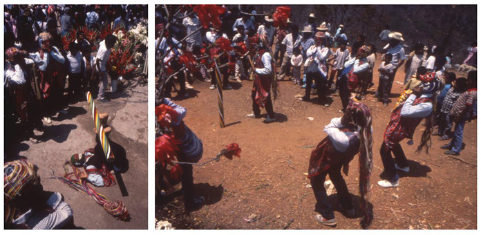 Les Cotlatlaztin forment un groupe cérémoniel masculin d’antipodistes14 et d’athlètes. Ils exécutent des jongleries rituelles en faisant tournoyer une bille de bois sur leurs pieds, des chorégraphies sonores ainsi que des parcours rituels réalisés en courses à pied (carrera de resistencia)15. Ils ne se produisent que durant les fêtes des saisons des pluies. Leur préparation commence pendant le mois d’avril, moment de la première fête importante du cycle agricole, avec la Saint-Marc le 24 avril où chaque agriculteur fait bénir ses semences de maïs, de haricot et de courges (bendición de las semillas). Leur activité cérémonielle principale consiste à intervenir dans différentes séquences des cérémonies de demande de pluie, en particulier lors de la fête de la Sainte-Croix, du 1er au 5 mai. Celle-ci constitue le point culminant du cycle des cérémonies agricoles couplées au culte des montagnes (cerros) dans tout l’état de Guerrero16.