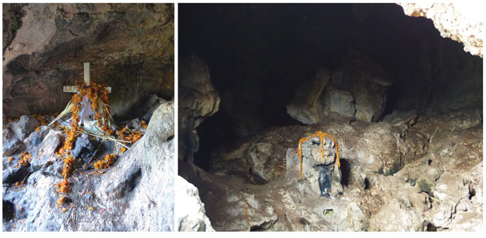 On s’occupe également des grottes. La croix située à l’entrée de la grotte d’Oxtotitlán, non loin des fresques olmèques, est de particulière importance. On rend offrande également aux concrétions calcaires qui personnifient des êtres non-humains (le chien, el perro, par exemple) à qui l’on dépose des colliers de fleurs de cempazuchil (oeillets d’Inde), des bougies, de l’encens25. Enfin, le 3 mai, on révère les croix situées aux sources du bas du village (Colotipán). En tout, ce sont plus de 200 points dont les hommes-vents doivent s’occuper, en transportant les vêtements miniatures jusqu’aux limites du terrain communautaire26.