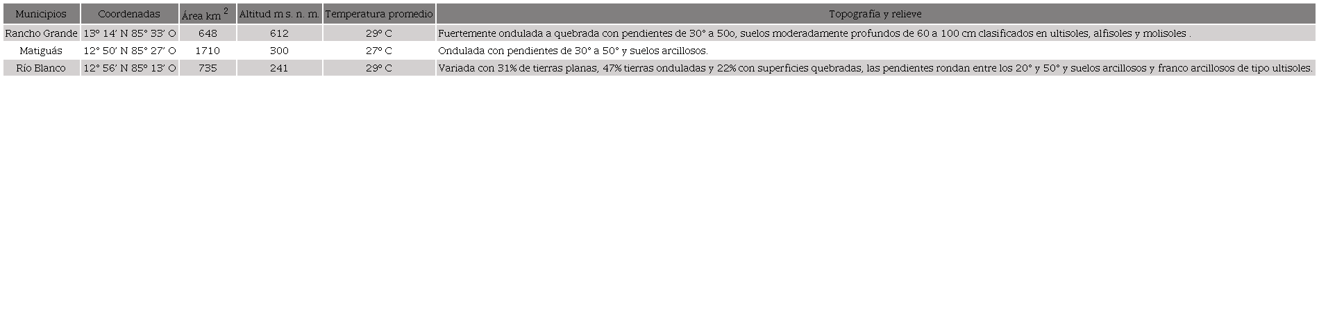 El estudio se llevó a cabo en el año 2018 en veintitrés comunidades de los municipios de Rancho Grande, Matiguás y Río Blanco, del departamento de Matagalpa, ubicadas en el norte centro de Nicaragua. En Rancho Grande se colectó información de quince comunidades: Achiote Central, Achiote Arriba, Buenos Aires, Carpa 2, Carpa 3, Colonia 1, Colonia 2, Cuyuca, El Comején, El Cortijo, El Rosario, La Nueva, San Francisco, Caño Blanco y El Cacao. En Matiguás de tres comunidades: La Patriota, El Corozo y El Congo, y en Río Blanco de cinco comunidades: Manceras, El Guabo, Cuatro Esquinas, San Pedro de Wanawana y El Anzuelo. En la tabla 1 se muestran las principales características de la zona de estudio.