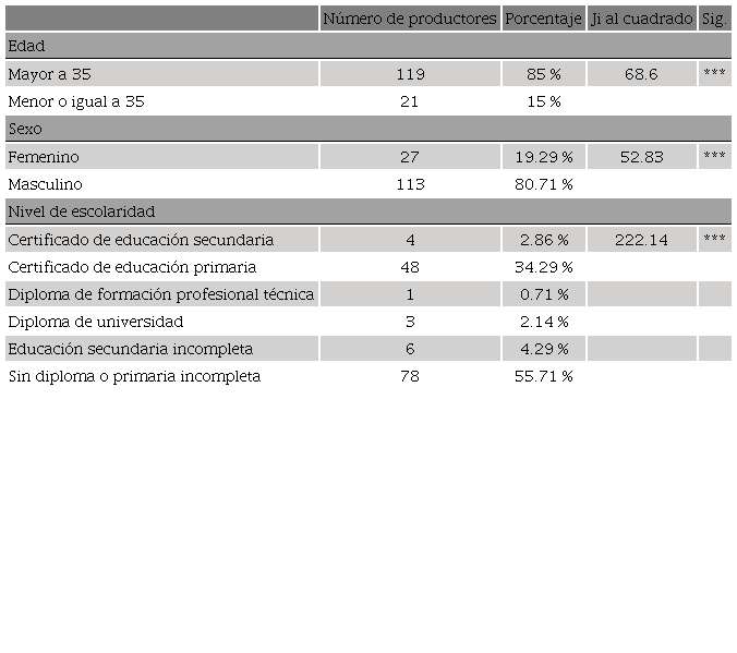 En la tabla 2 se observa que el 85 % [c2 (1, 68.6) p < 0.001] de los productores son mayores de los treinta y cinco años y en su mayoría hombres [80.71 %; c2 (1, 52.83) p < 0.001], lo que muestra que en gran parte los productores están en plena madurez para realizar la actividad productiva, tal y como sucede en la mayor parte de los sistemas de producción cacaotera (Hernández Gómez et al. 2015), y este dato es acorde con lo reportado por Sobalbarro Figueroa et al. (2020), quienes encontraron que de los cacaoteros de Honduras, cerca del 78 % de los encuestados eran hombres y el 75 % tenía treinta y cinco años o más.